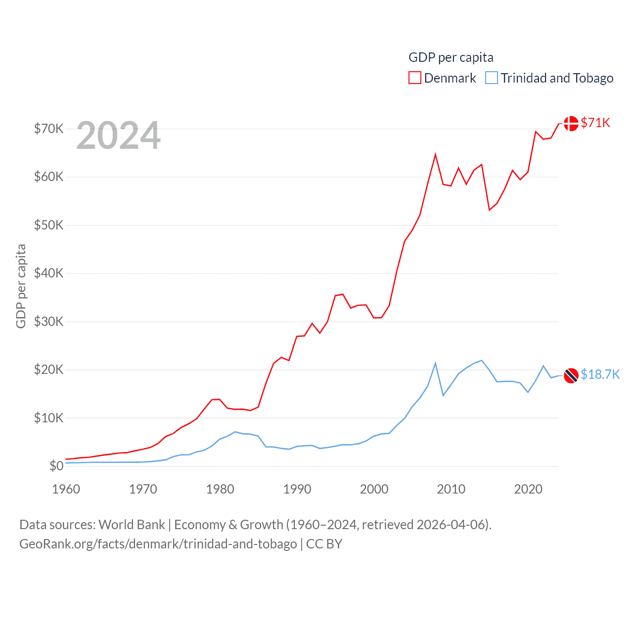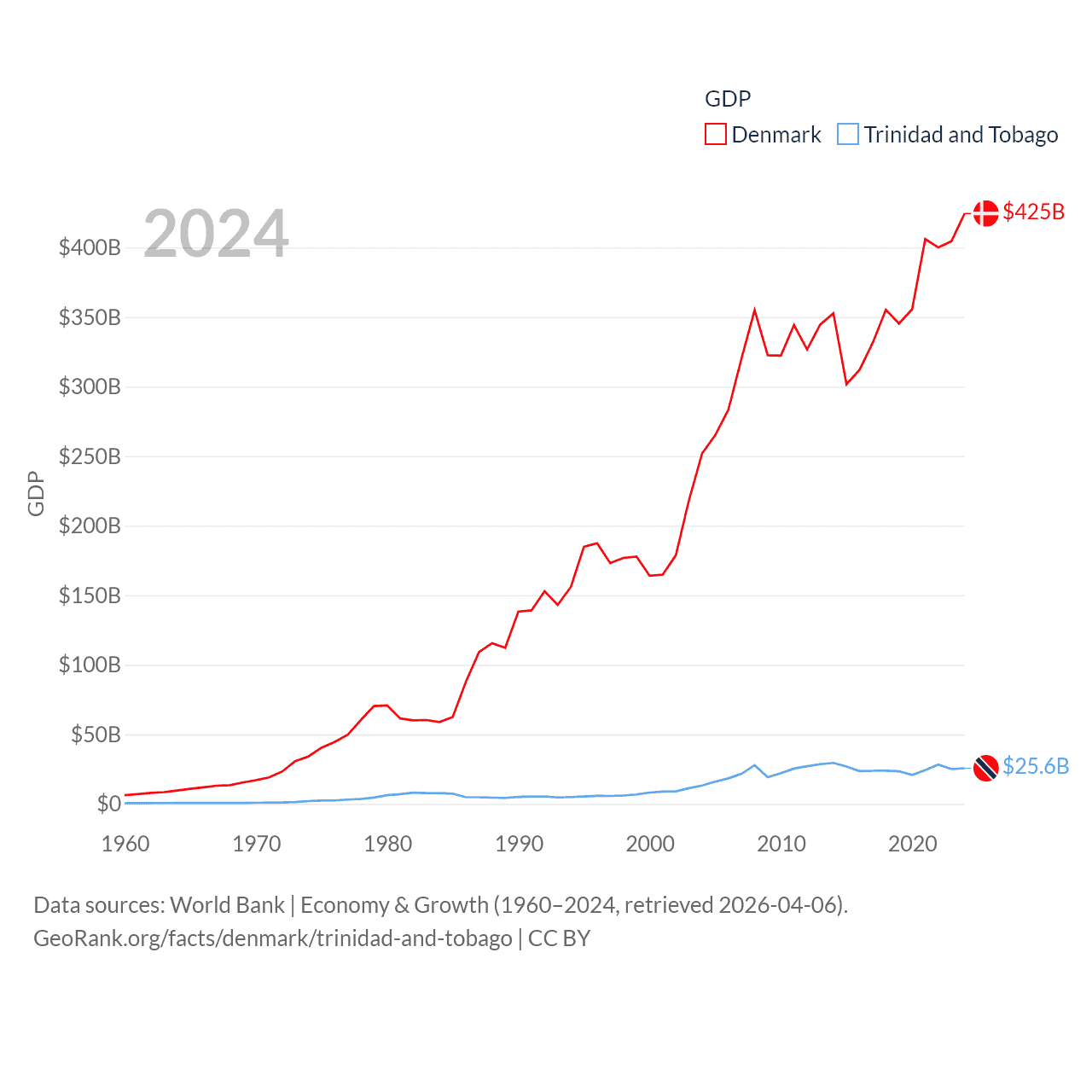 By GDP, Denmark ranks 37/197 ($425B) and Trinidad and Tobago ranks 115/197 ($25.6B). By GDP per capita, Denmark ranks 12/197 ($71,026), while Trinidad and Tobago ranks 61/197 ($18,733).
