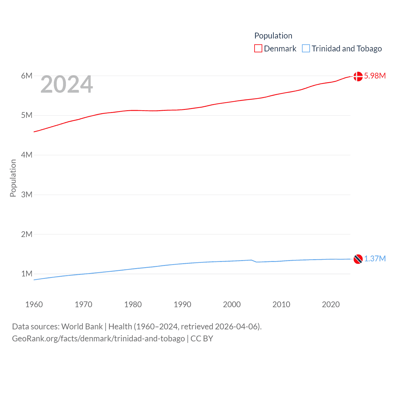 Denmark has a population of 5.98M (ranked 114/197), compared with 1.37M in Trinidad and Tobago (ranked 154/197). Denmark's land area is 15,444 sq mi versus 1,981 sq mi for Trinidad and Tobago (ranked 130th vs. 166th).