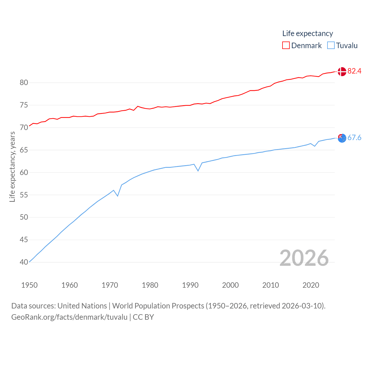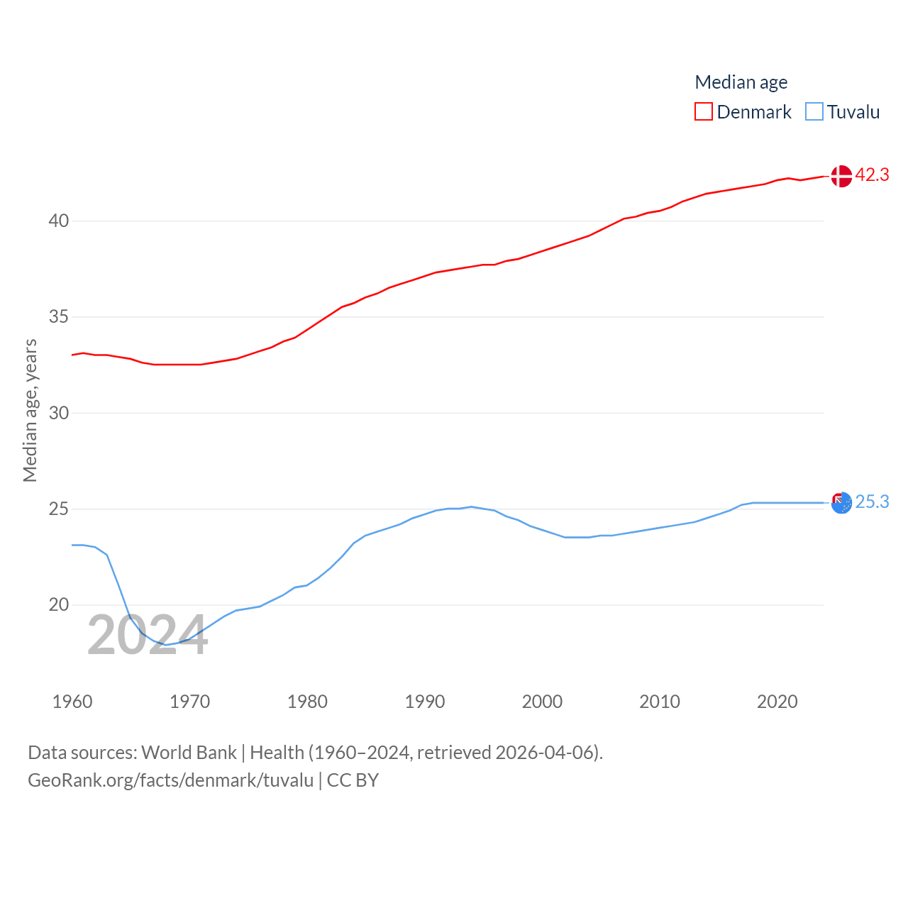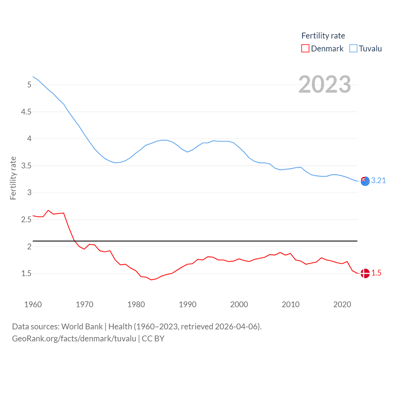 Denmark has a population of 5.98M (ranked 114/197), compared with 9.65K in Tuvalu (ranked 196/197). Denmark's land area is 15,444 sq mi versus 11.6 sq mi for Tuvalu (ranked 130th vs. 194th).