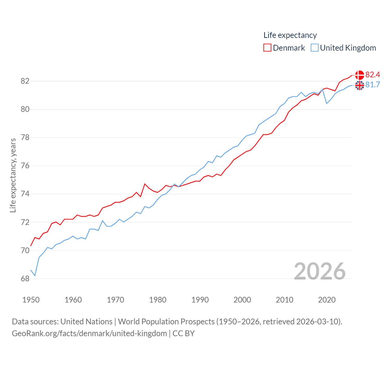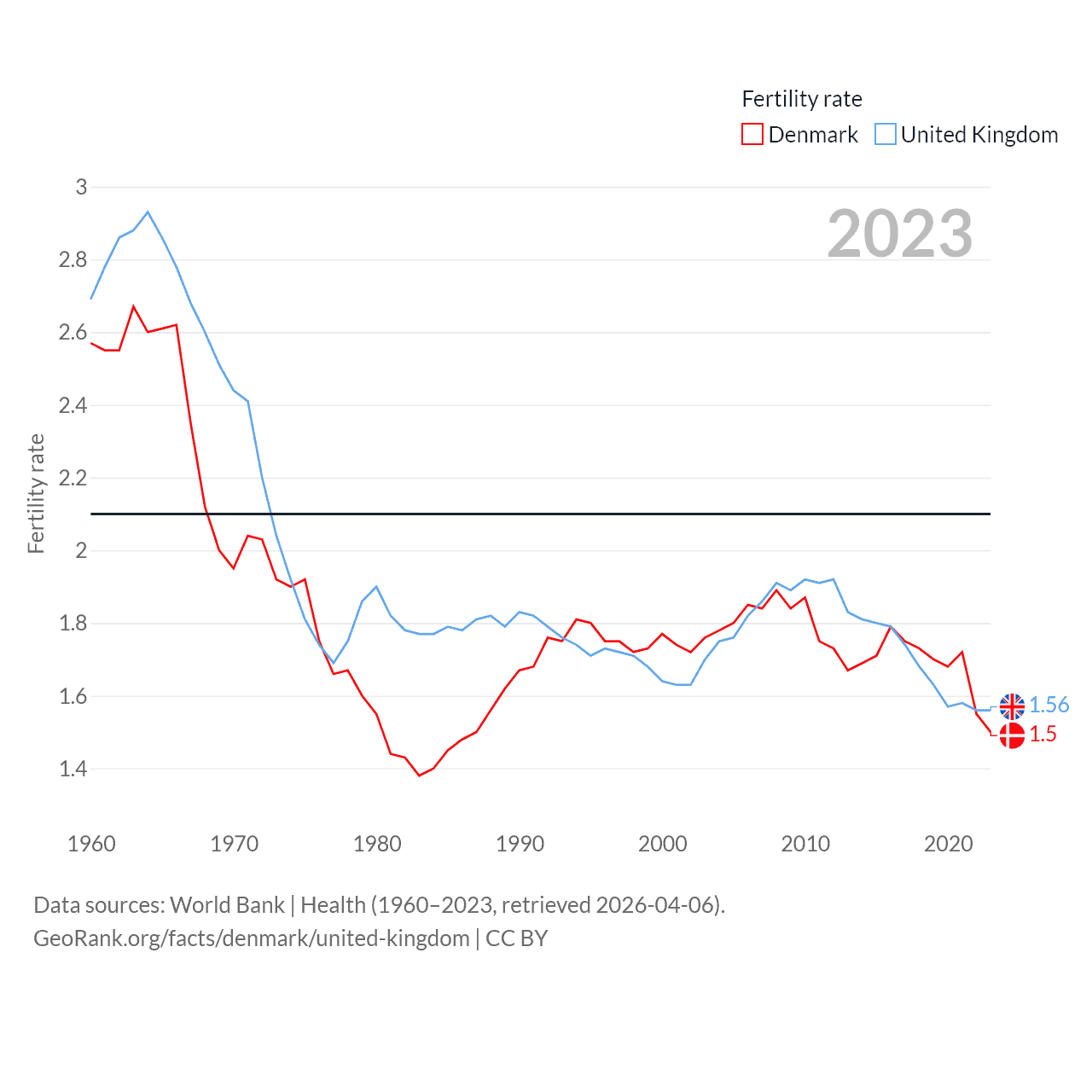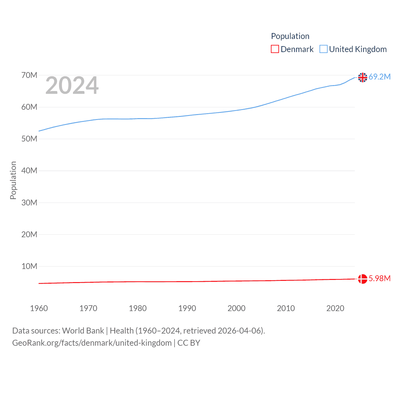 Denmark has a population of 5.98M (ranked 114/197), compared with 69.2M in The United Kingdom (ranked 21/197). Denmark's land area is 15,444 sq mi versus 93,410 sq mi for The United Kingdom (ranked 130th vs. 78th).