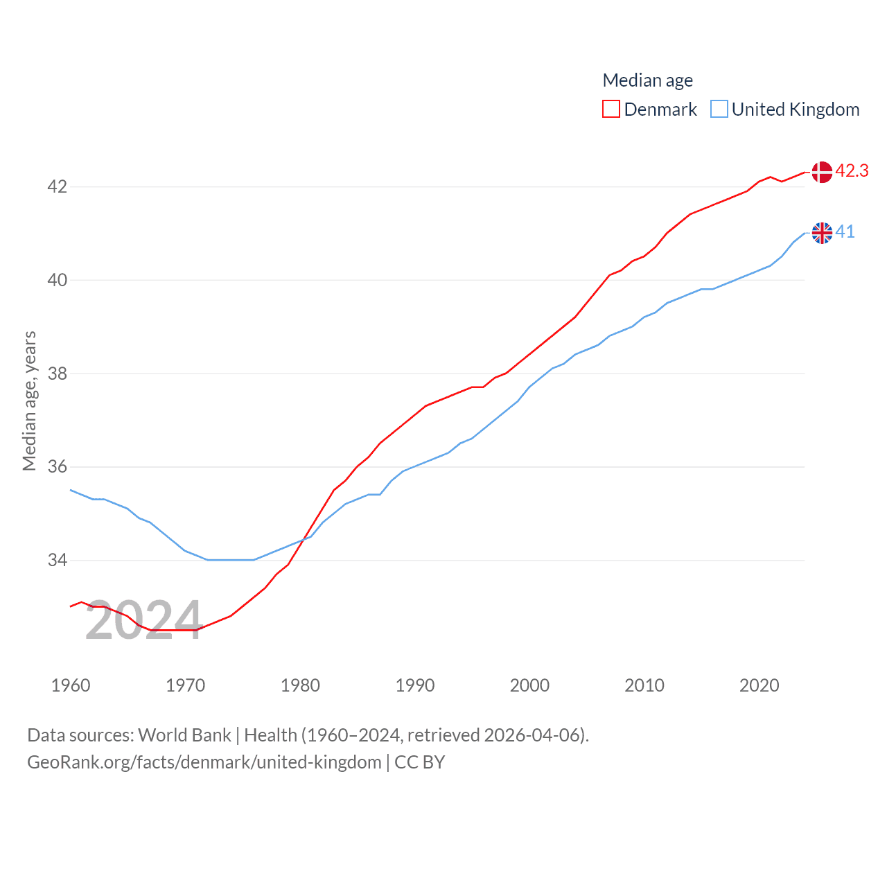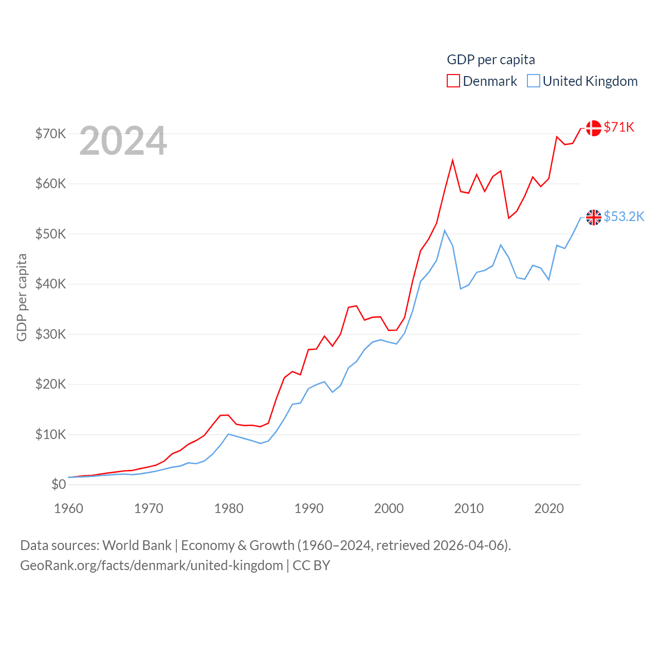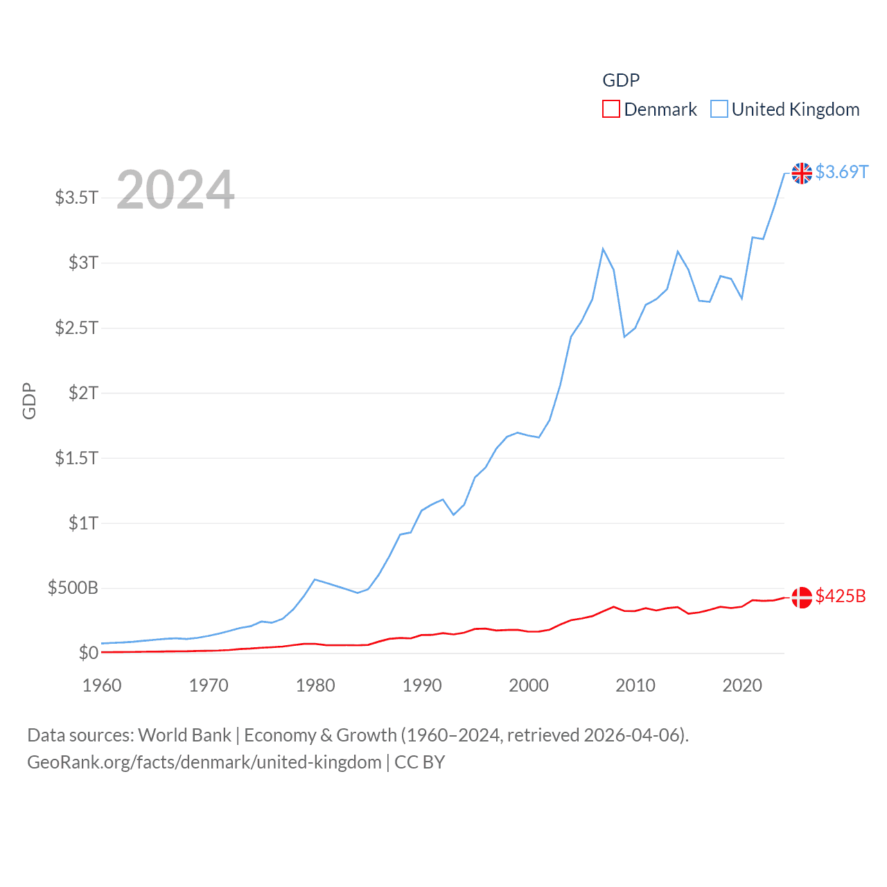By GDP, Denmark ranks 37/197 ($425B) and The United Kingdom ranks 6/197 ($3.69T). By GDP per capita, Denmark ranks 12/197 ($71,026), while The United Kingdom ranks 22/197 ($53,246).