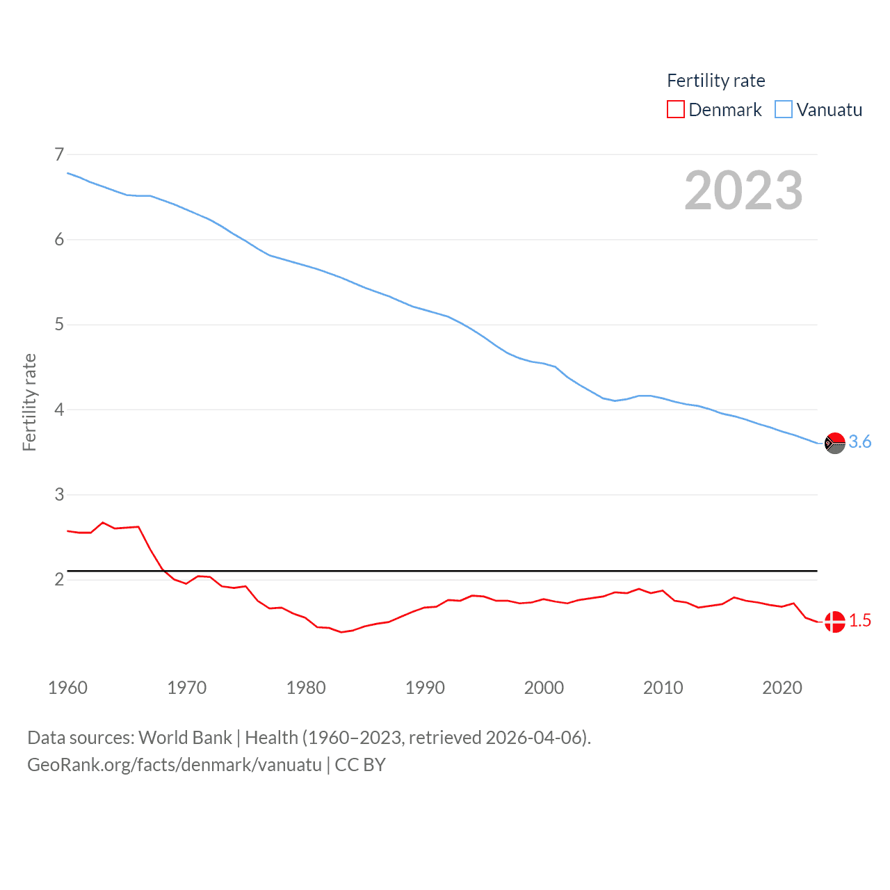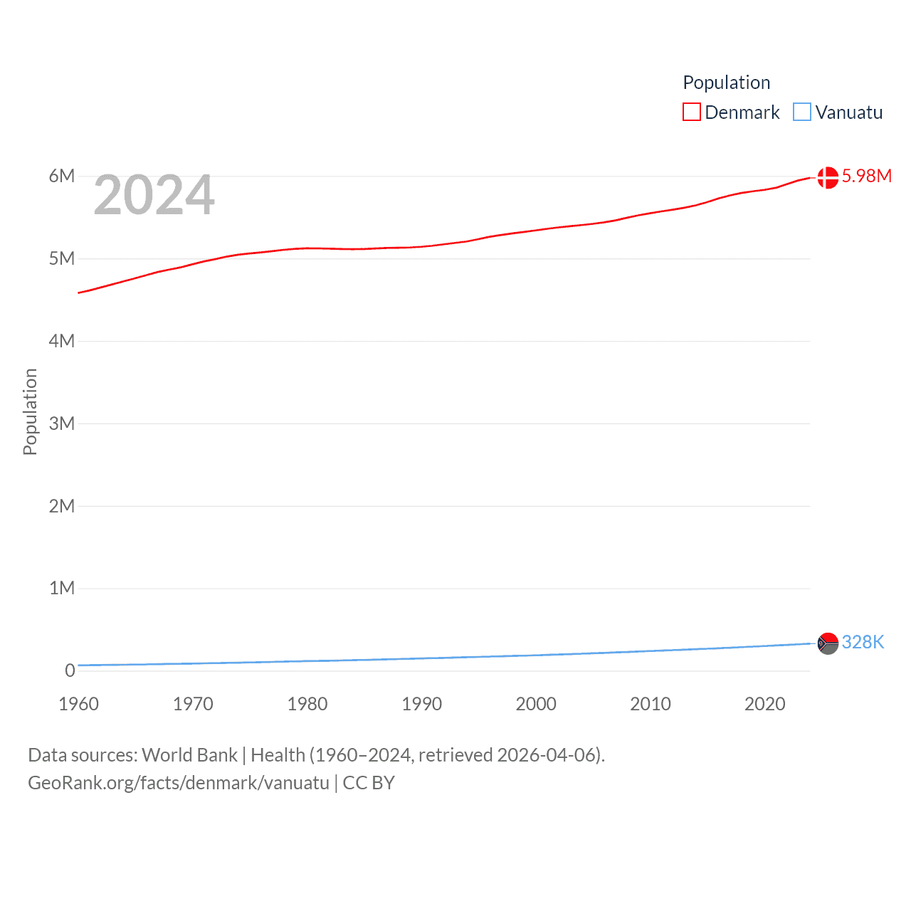 Denmark has a population of 5.98M (ranked 114/197), compared with 328K in Vanuatu (ranked 174/197). Denmark's land area is 15,444 sq mi versus 4,707 sq mi for Vanuatu (ranked 130th vs. 157th).