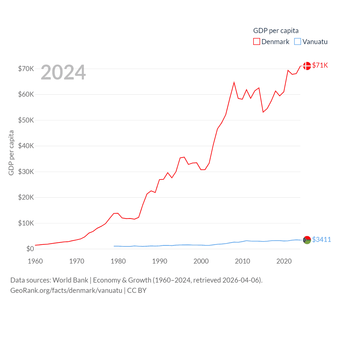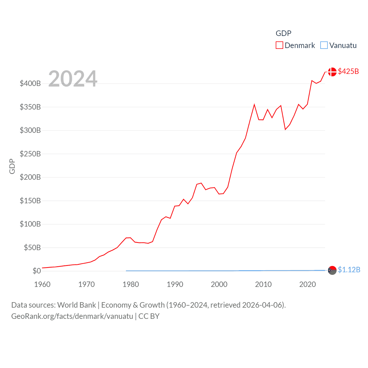 By GDP, Denmark ranks 37/197 ($425B) and Vanuatu ranks 188/197 ($1.12B). By GDP per capita, Denmark ranks 12/197 ($71,026), while Vanuatu ranks 137/197 ($3,411).