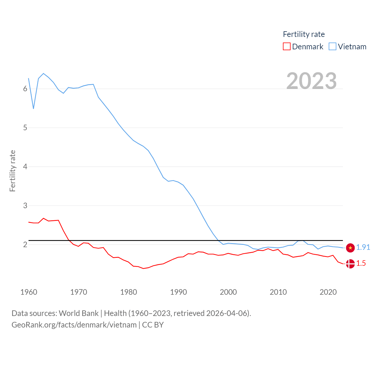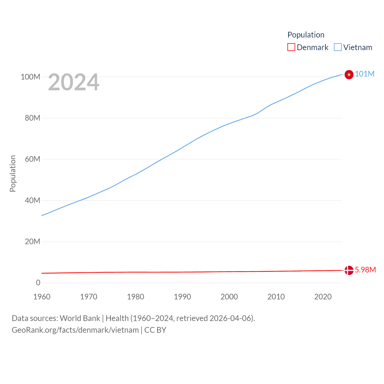 Denmark has a population of 5.98M (ranked 114/197), compared with 101M in Vietnam (ranked 16/197). Denmark's land area is 15,444 sq mi versus 121,016 sq mi for Vietnam (ranked 130th vs. 67th).