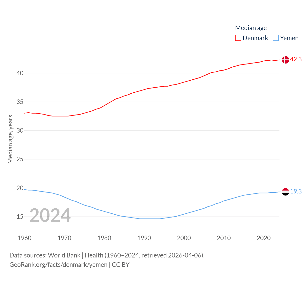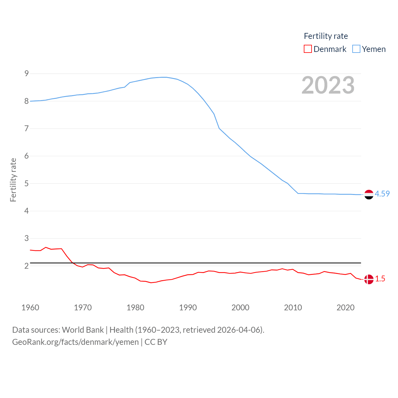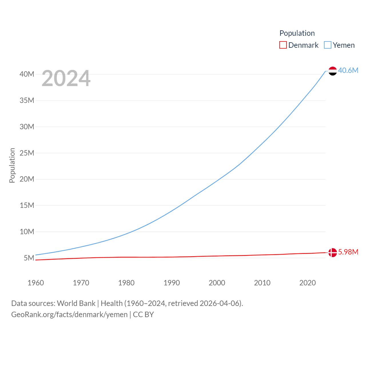 Denmark has a population of 5.98M (ranked 114/197), compared with 40.6M in Yemen (ranked 38/197). Denmark's land area is 15,444 sq mi versus 203,850 sq mi for Yemen (ranked 130th vs. 49th).