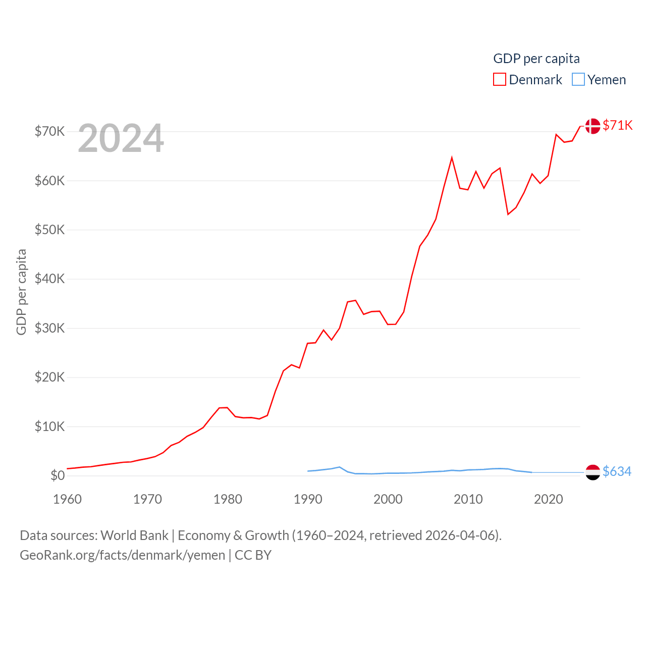 By GDP, Denmark ranks 37/197 ($425B) and Yemen ranks 125/197 ($21.6B). By GDP per capita, Denmark ranks 12/197 ($71,026), while Yemen ranks 191/197 ($634).