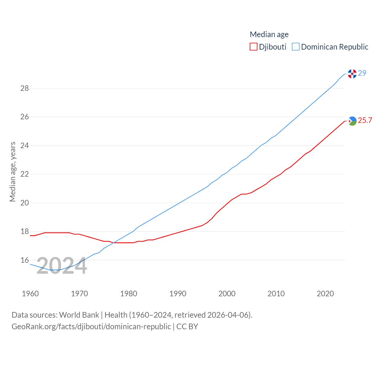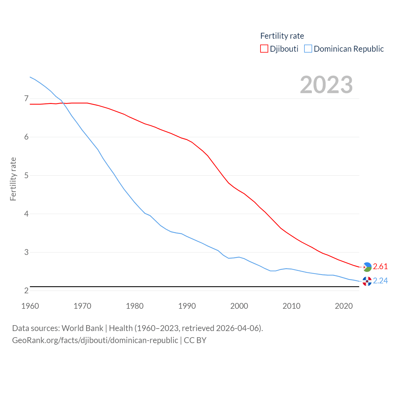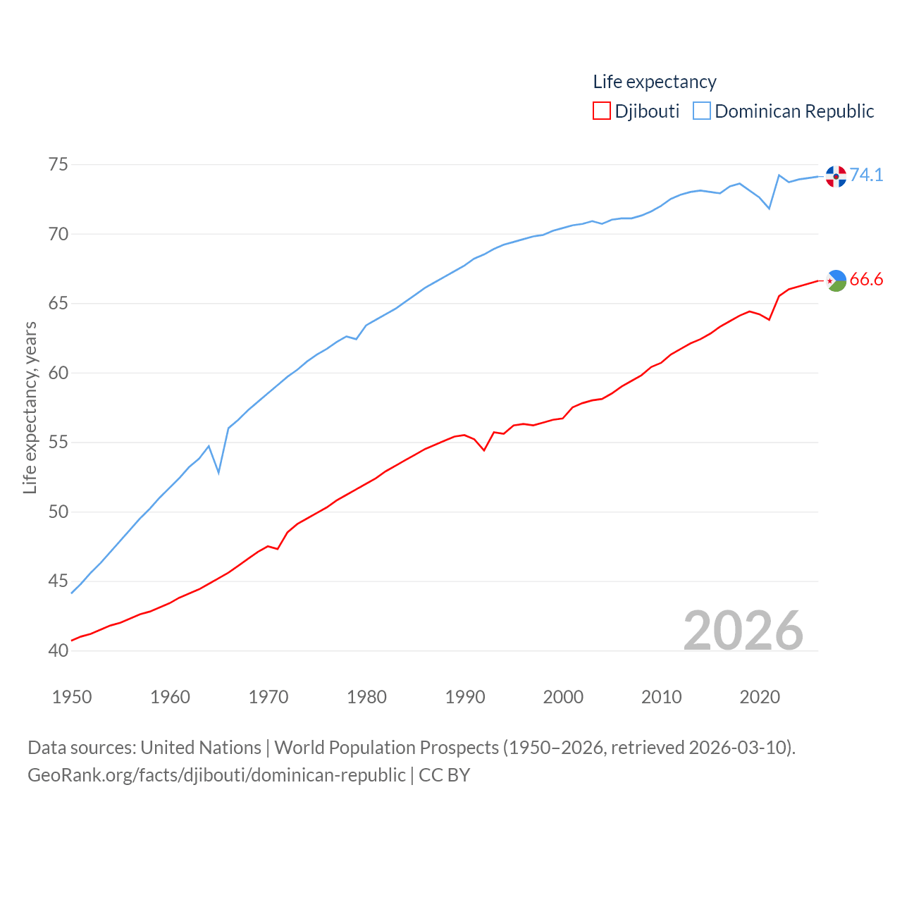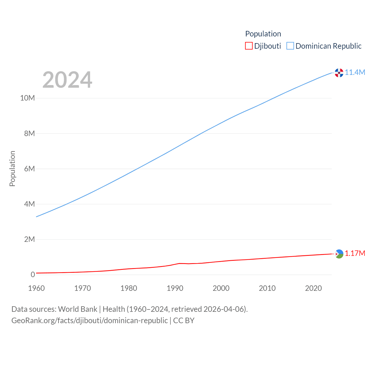 Djibouti has a population of 1.17M (ranked 158/197), compared with 11.4M in The Dominican Republic (ranked 85/197). Djibouti's land area is 8,950 sq mi versus 18,609 sq mi for The Dominican Republic (ranked 147th vs. 127th).