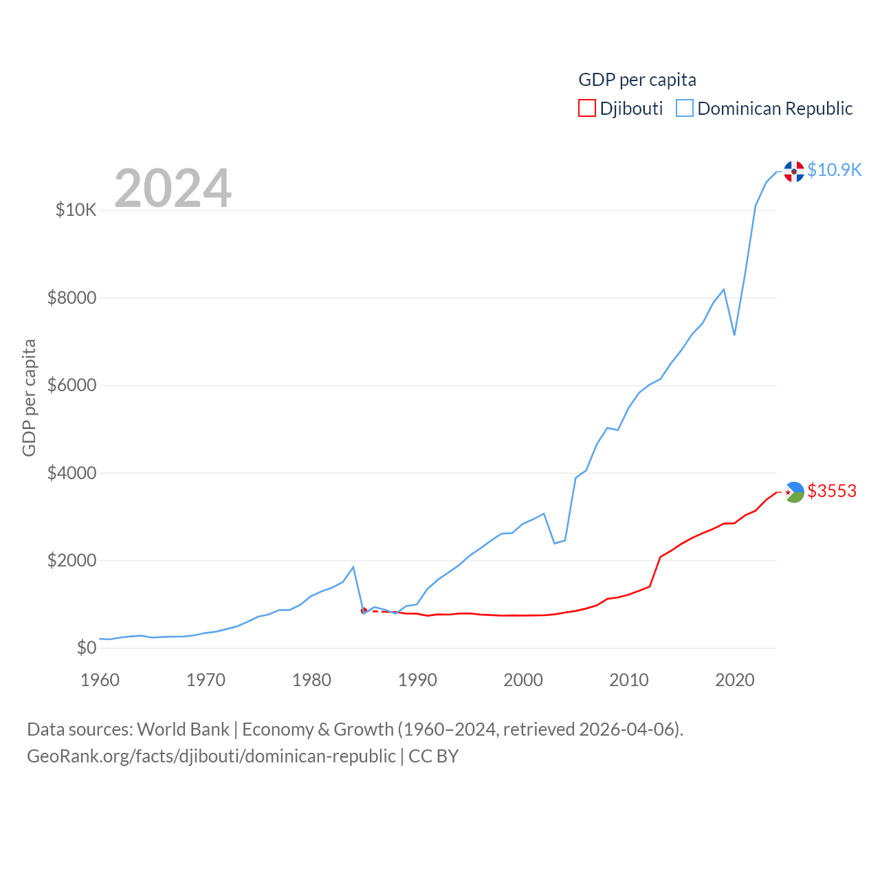 By GDP, Djibouti ranks 165/197 ($4.15B) and The Dominican Republic ranks 63/197 ($124B). By GDP per capita, Djibouti ranks 133/197 ($3,553), while The Dominican Republic ranks 83/197 ($10,876).