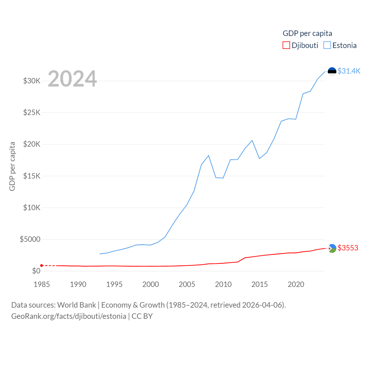 By GDP, Djibouti ranks 165/197 ($4.15B) and Estonia ranks 100/197 ($43.1B). By GDP per capita, Djibouti ranks 133/197 ($3,553), while Estonia ranks 40/197 ($31,428).