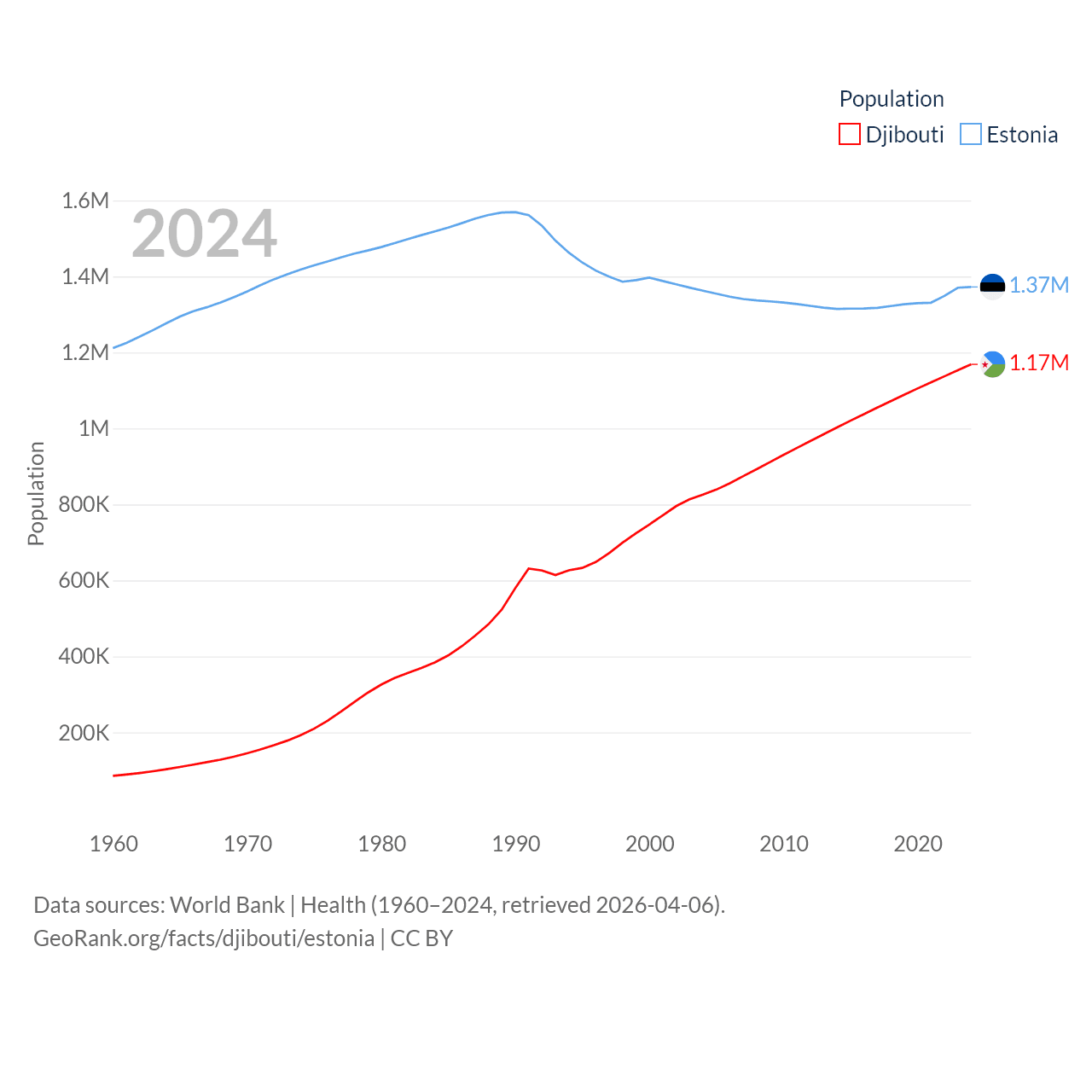 Djibouti has a population of 1.17M (ranked 158/197), compared with 1.37M in Estonia (ranked 153/197). Djibouti's land area is 8,950 sq mi versus 16,498 sq mi for Estonia (ranked 147th vs. 129th).
