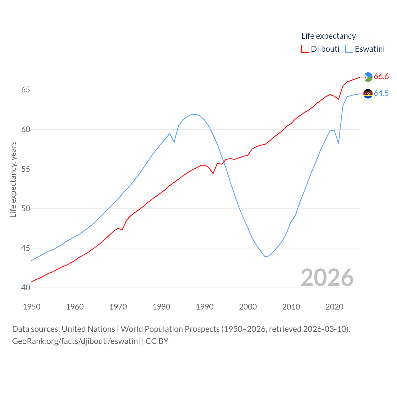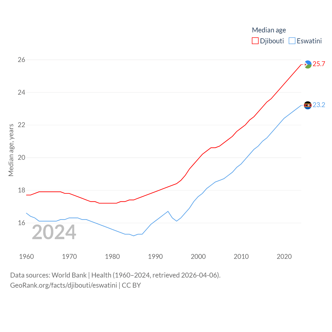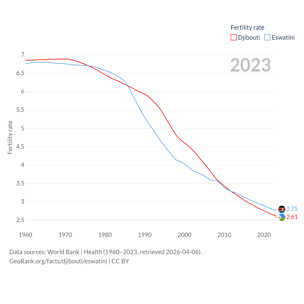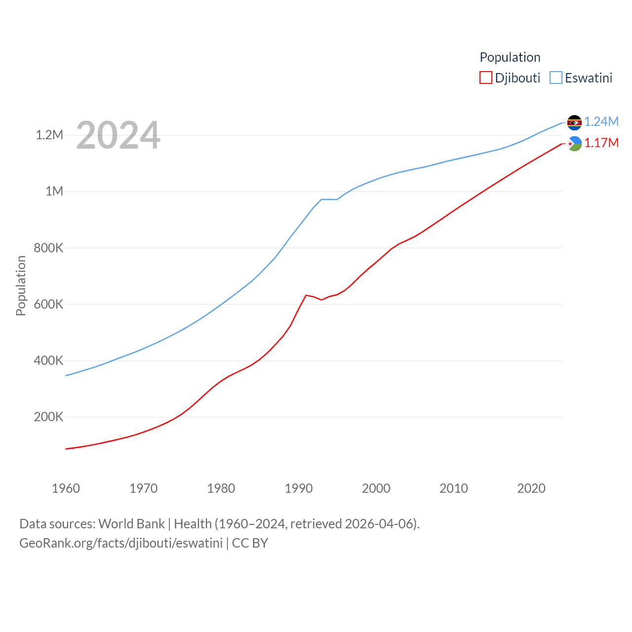Djibouti has a population of 1.17M (ranked 158/197), compared with 1.24M in Eswatini (ranked 157/197). Djibouti's land area is 8,950 sq mi versus 6,641 sq mi for Eswatini (ranked 147th vs. 154th).