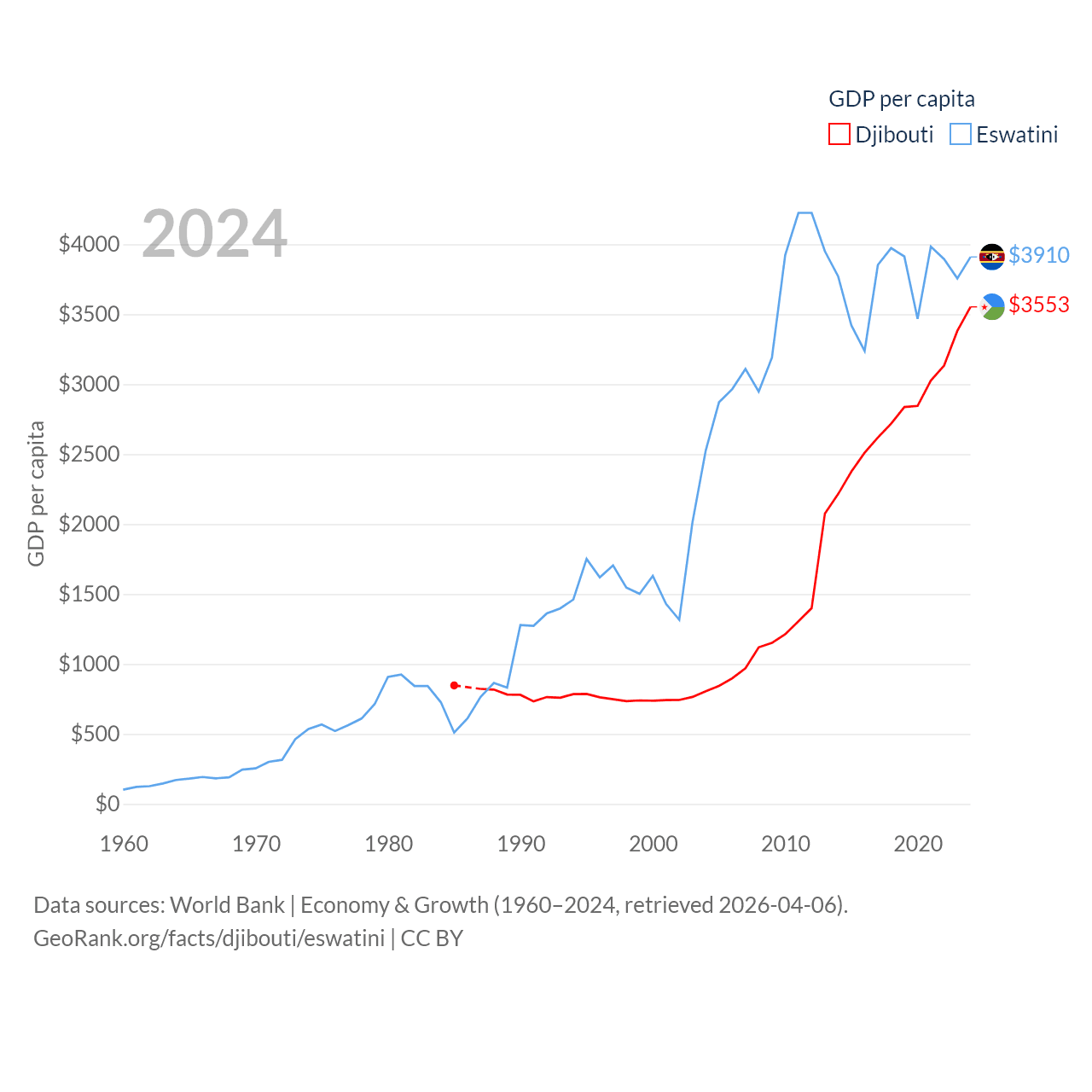 By GDP, Djibouti ranks 165/197 ($4.15B) and Eswatini ranks 162/197 ($4.86B). By GDP per capita, Djibouti ranks 133/197 ($3,553), while Eswatini ranks 131/197 ($3,910).