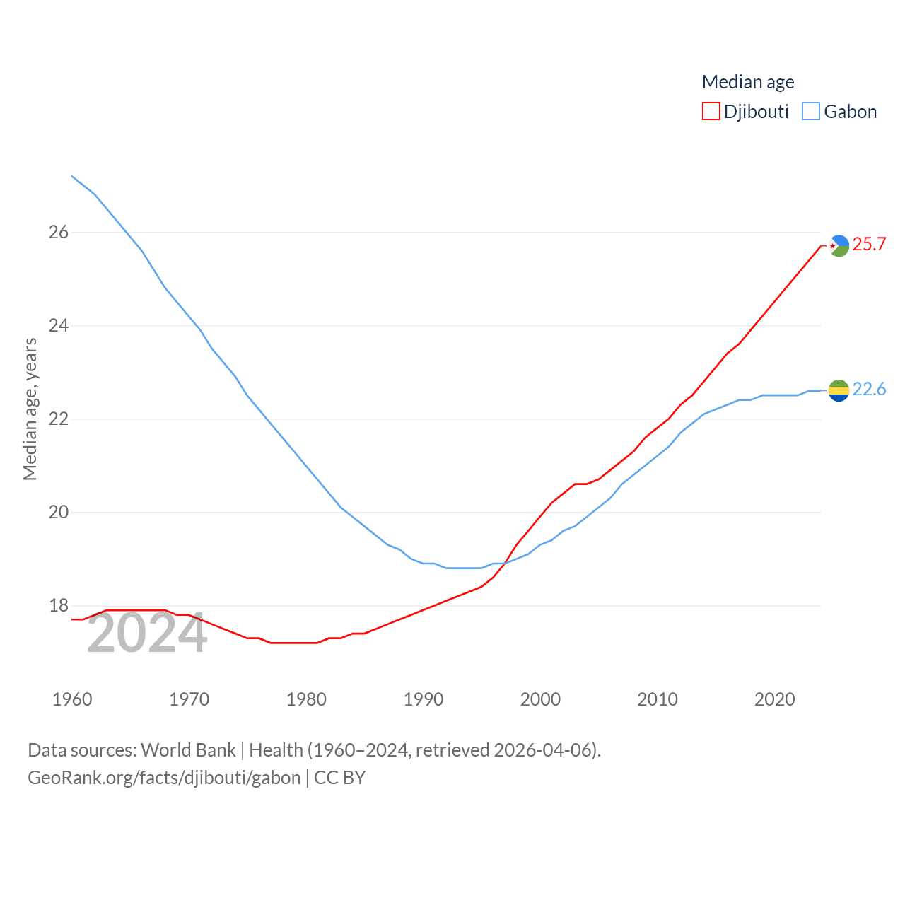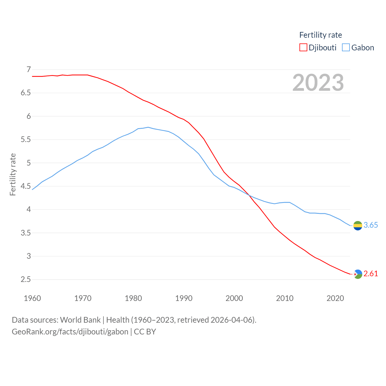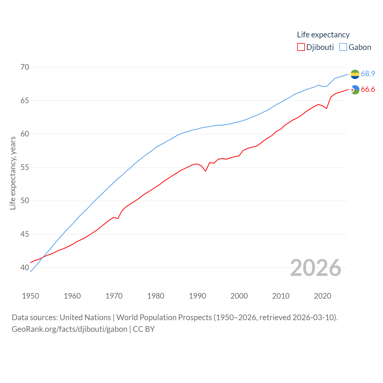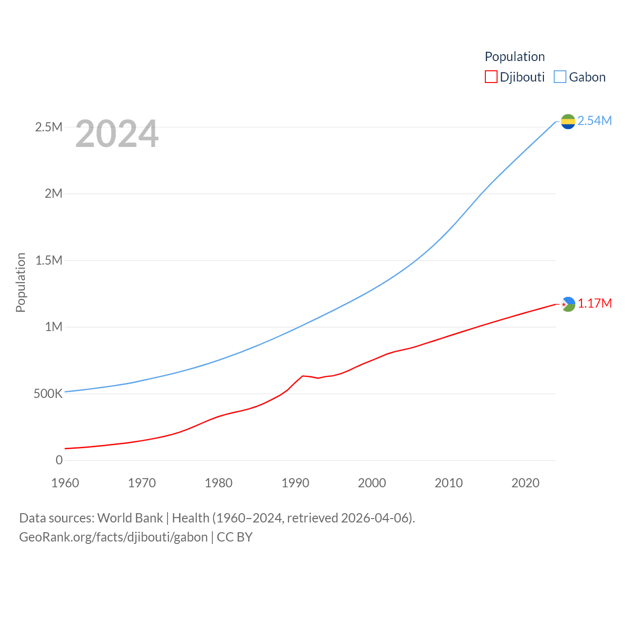 Djibouti has a population of 1.17M (ranked 158/197), compared with 2.54M in Gabon (ranked 141/197). Djibouti's land area is 8,950 sq mi versus 99,487 sq mi for Gabon (ranked 147th vs. 75th).