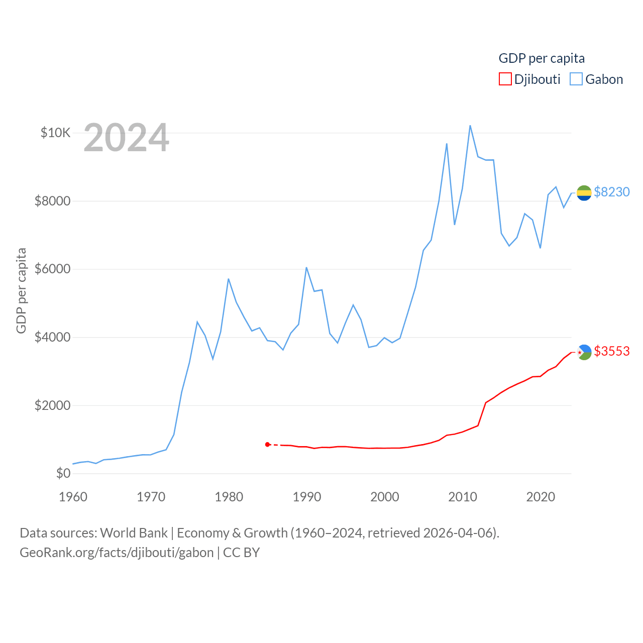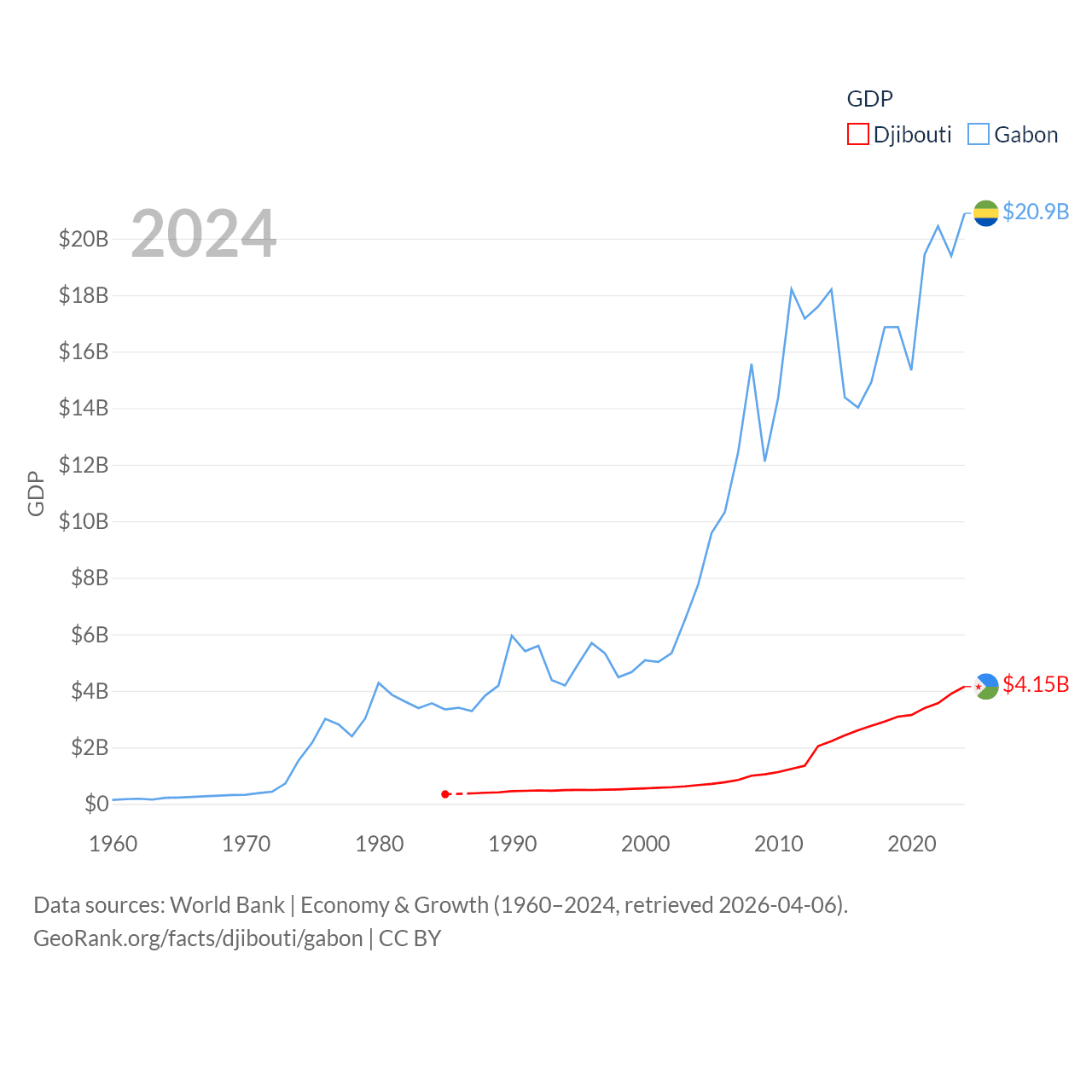By GDP, Djibouti ranks 165/197 ($4.15B) and Gabon ranks 127/197 ($20.9B). By GDP per capita, Djibouti ranks 133/197 ($3,553), while Gabon ranks 93/197 ($8,230).