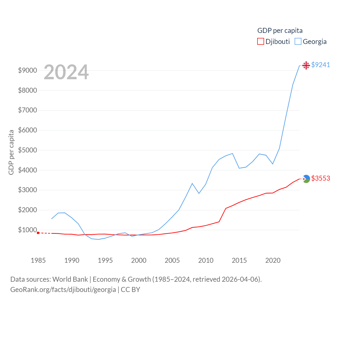 By GDP, Djibouti ranks 165/197 ($4.15B) and Georgia ranks 107/197 ($34.2B). By GDP per capita, Djibouti ranks 133/197 ($3,553), while Georgia ranks 89/197 ($9,241).