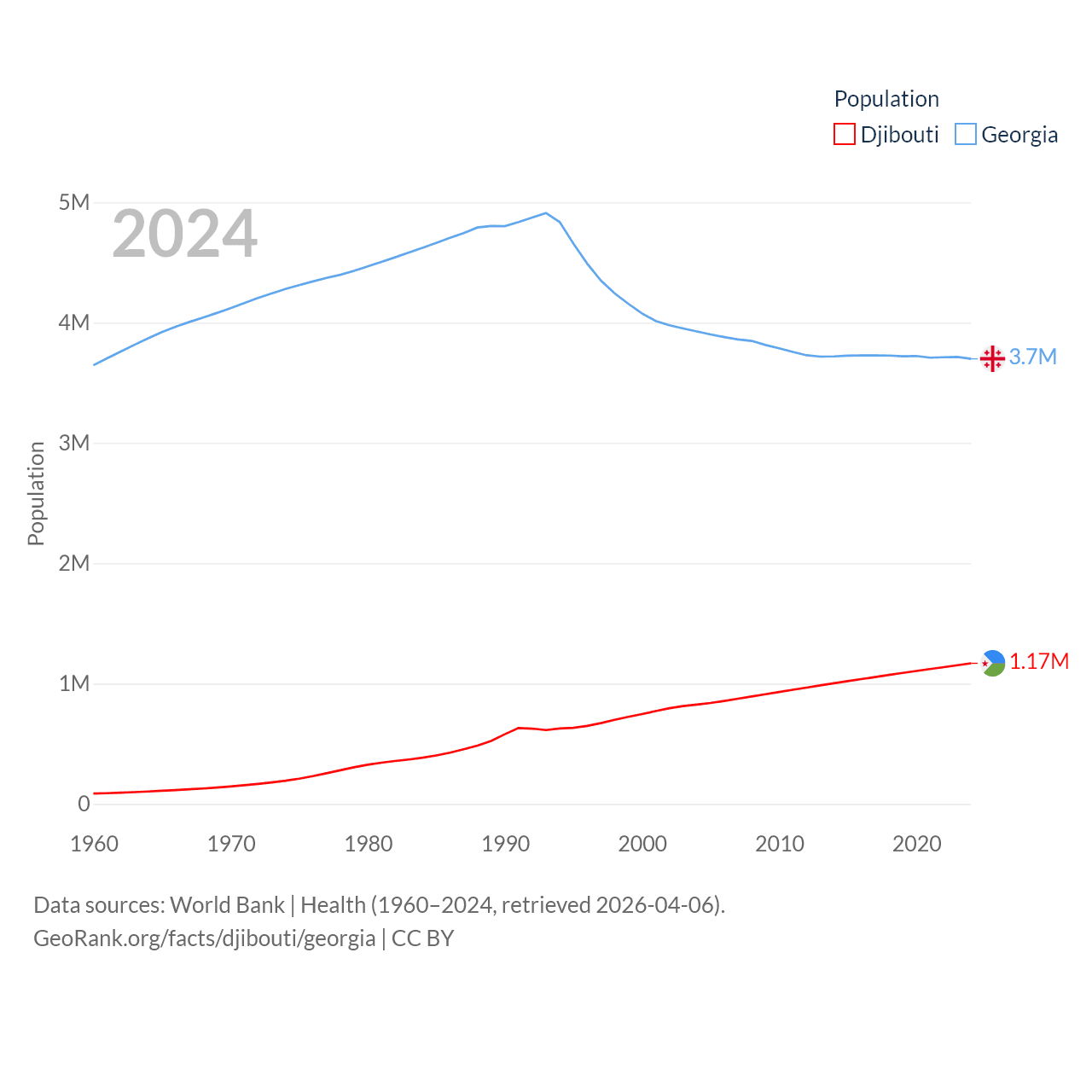 Djibouti has a population of 1.17M (ranked 158/197), compared with 3.7M in Georgia (ranked 130/197). Djibouti's land area is 8,950 sq mi versus 26,830 sq mi for Georgia (ranked 147th vs. 118th).