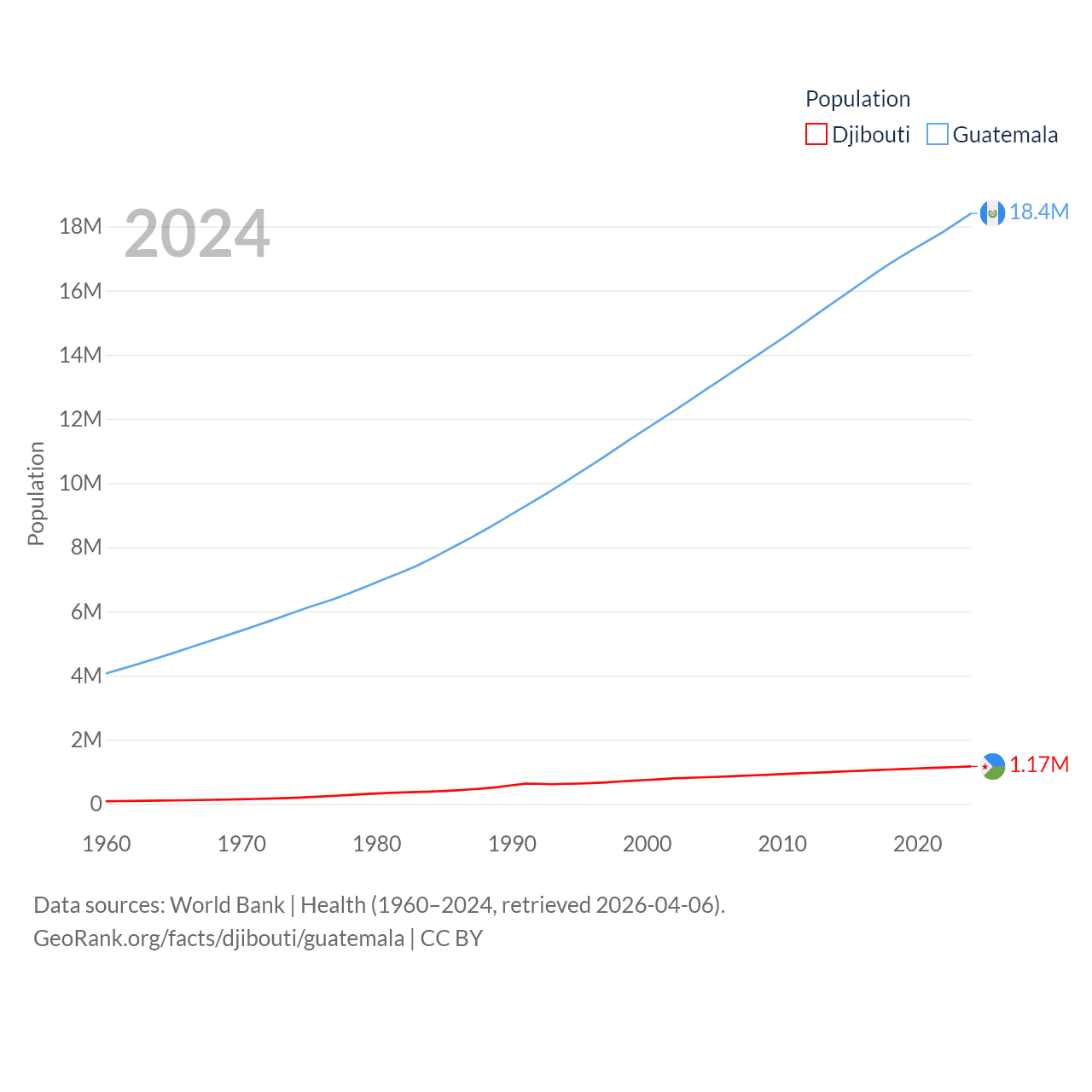 Djibouti has a population of 1.17M (ranked 158/197), compared with 18.4M in Guatemala (ranked 70/197). Djibouti's land area is 8,950 sq mi versus 41,375 sq mi for Guatemala (ranked 147th vs. 102nd).