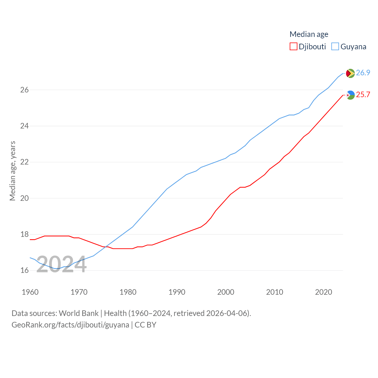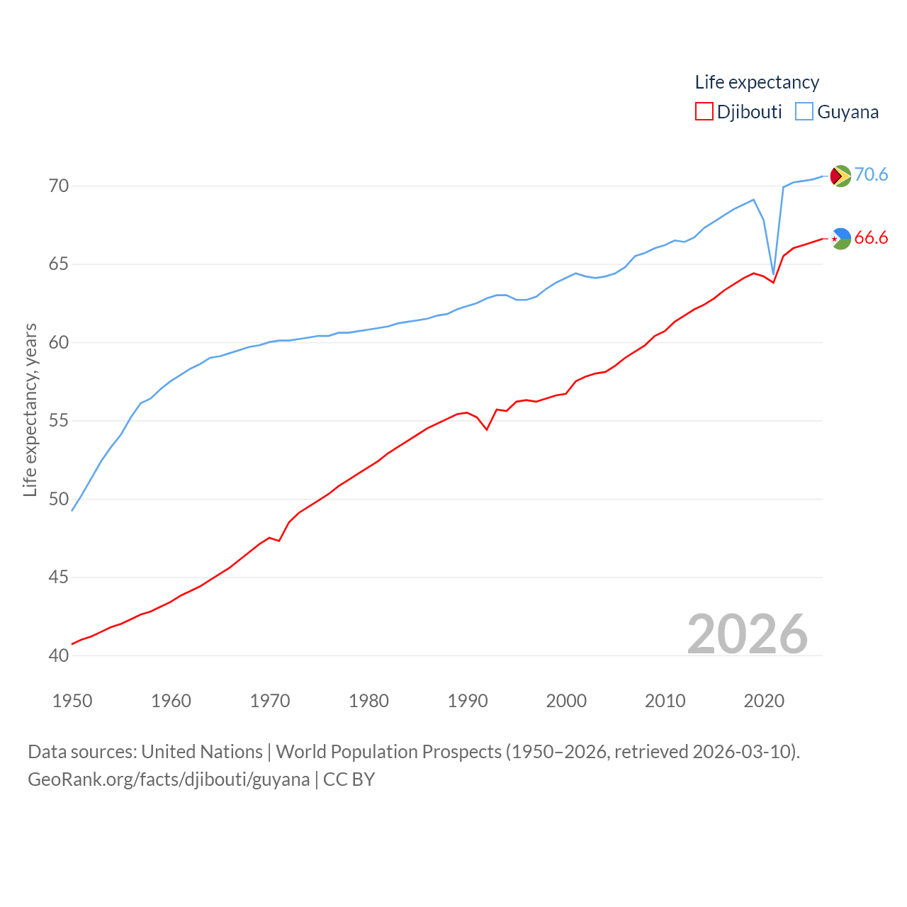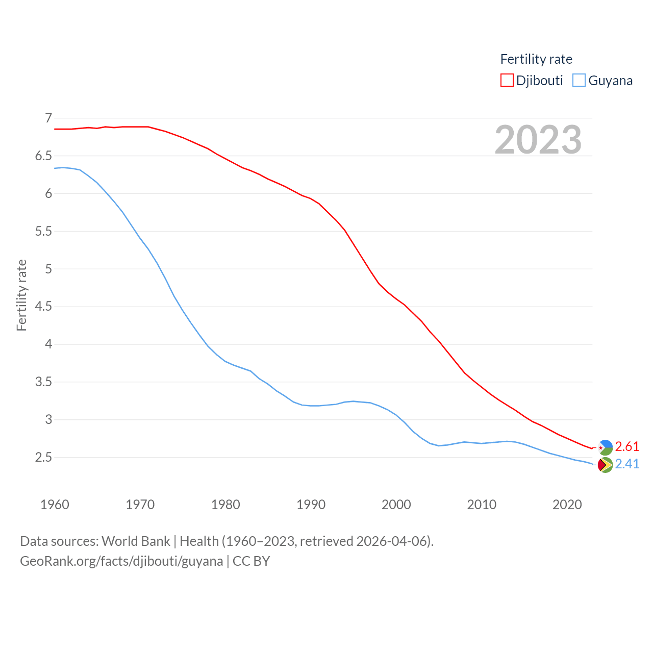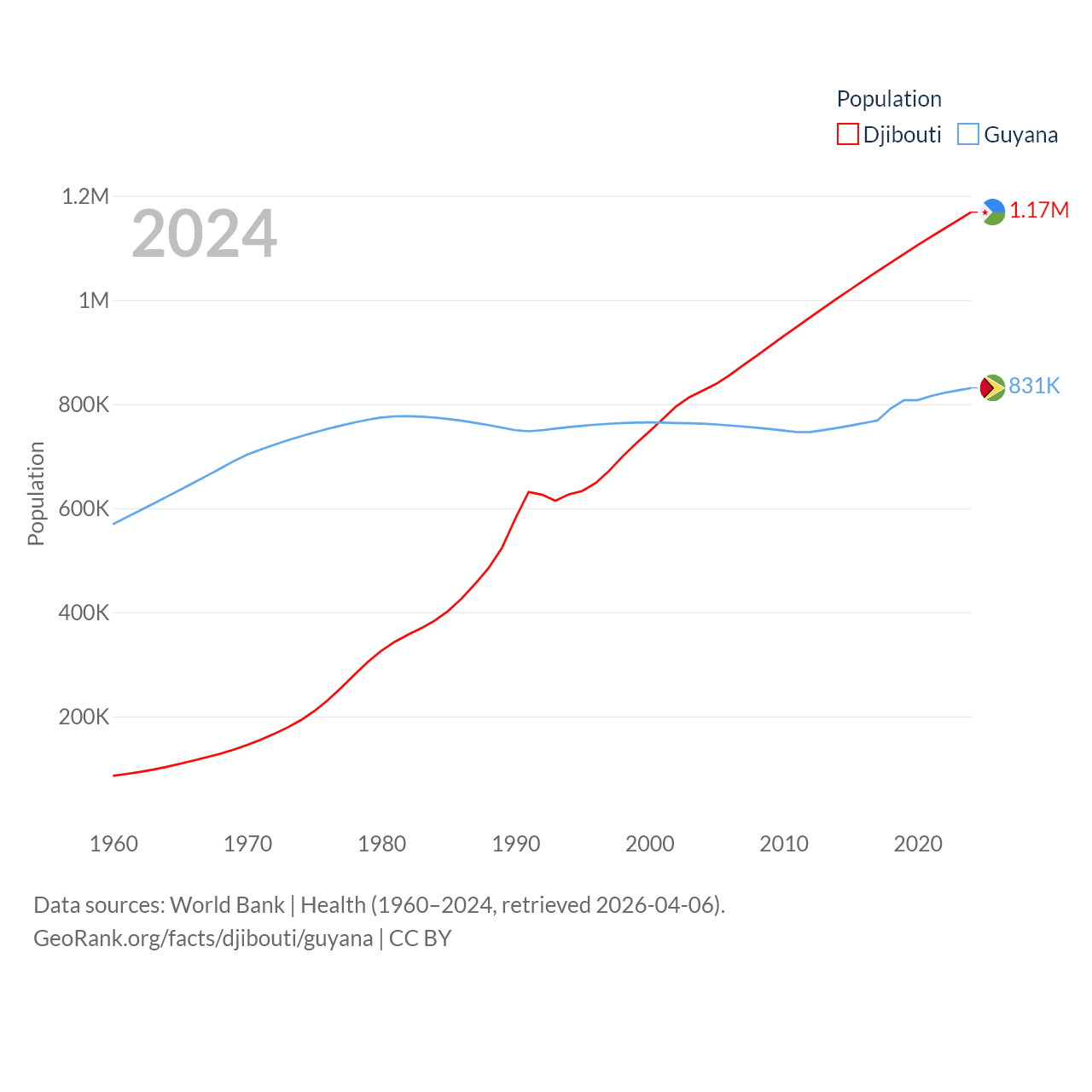 Djibouti has a population of 1.17M (ranked 158/197), compared with 831K in Guyana (ranked 161/197). Djibouti's land area is 8,950 sq mi versus 81,522 sq mi for Guyana (ranked 147th vs. 82nd).