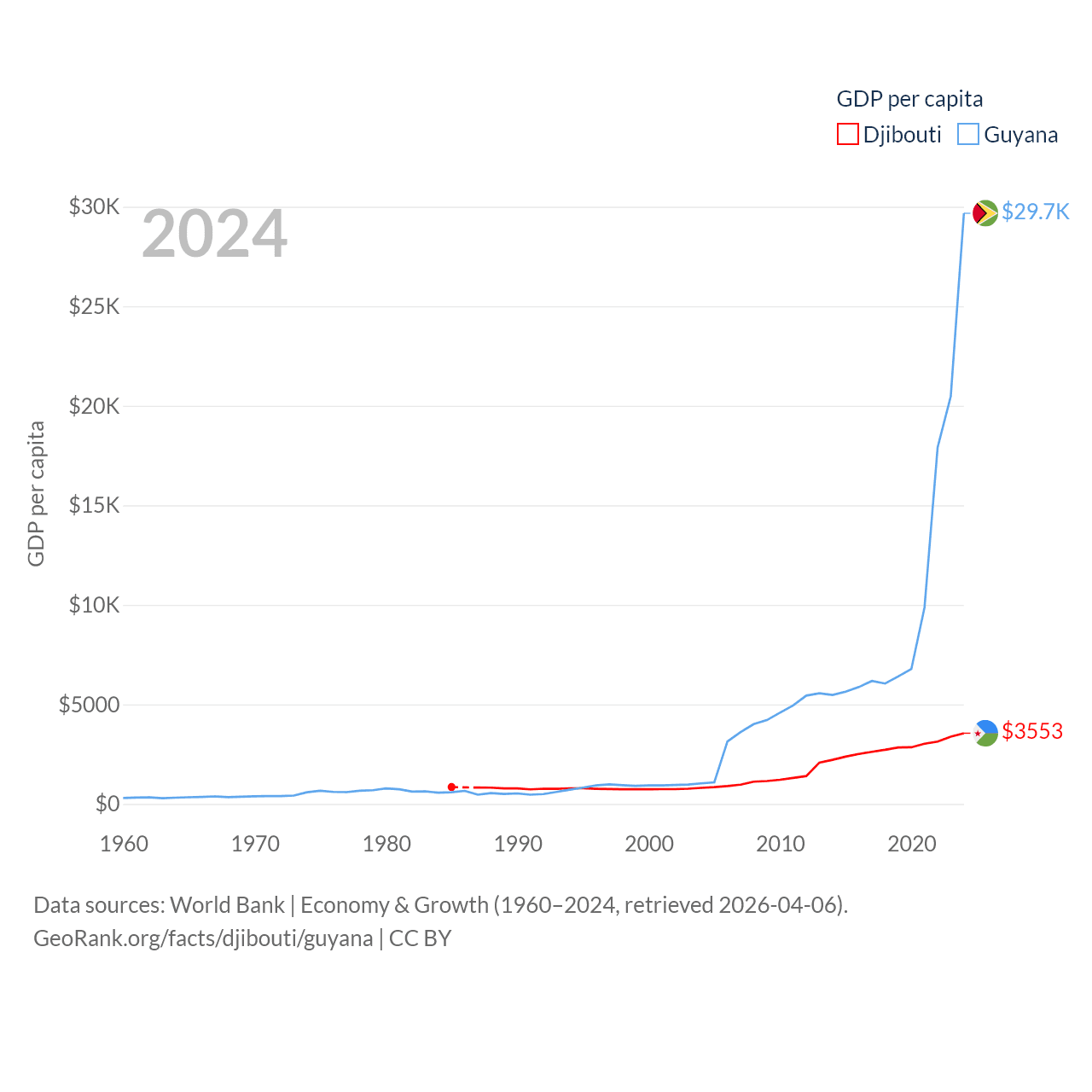 By GDP, Djibouti ranks 165/197 ($4.15B) and Guyana ranks 120/197 ($24.7B). By GDP per capita, Djibouti ranks 133/197 ($3,553), while Guyana ranks 41/197 ($29,675).