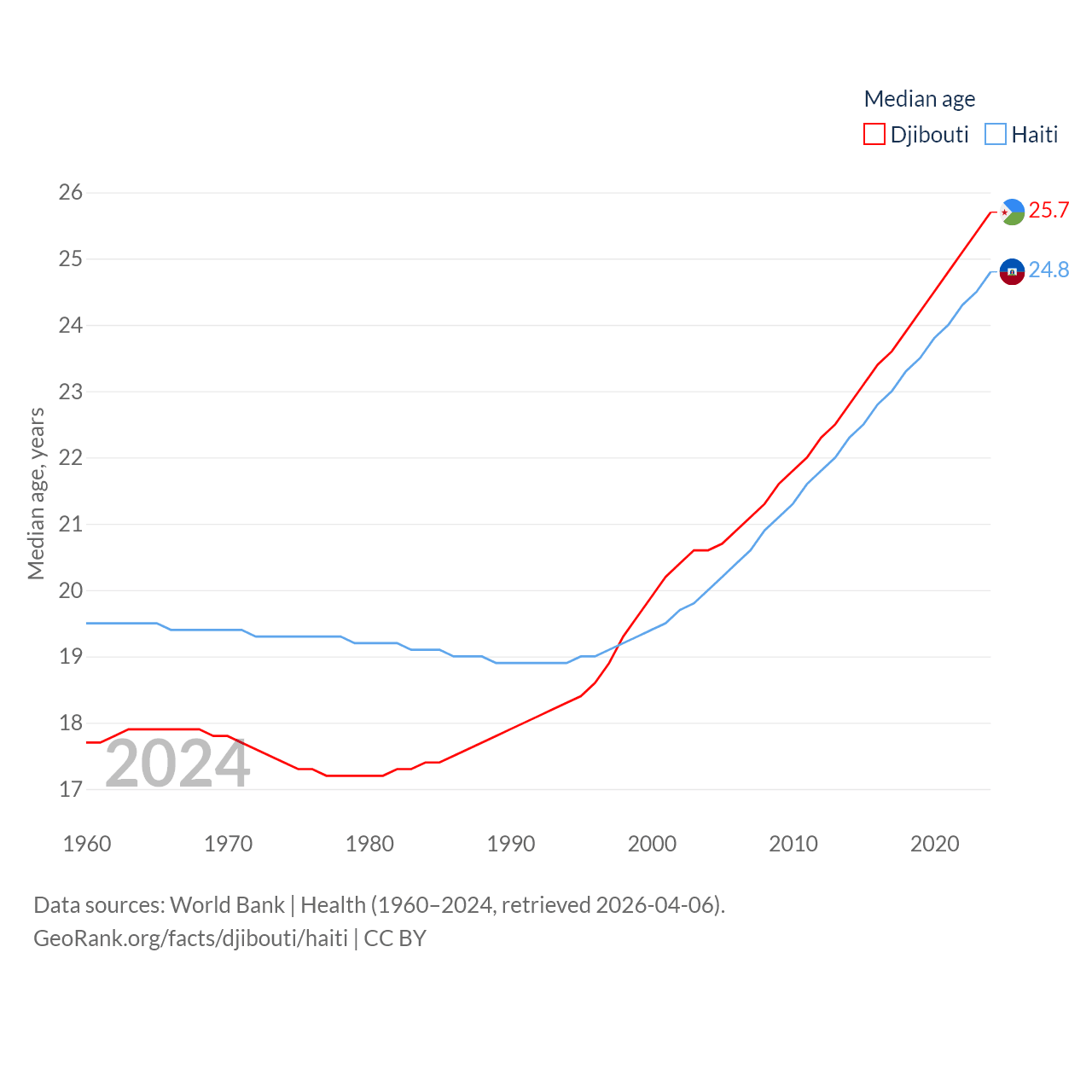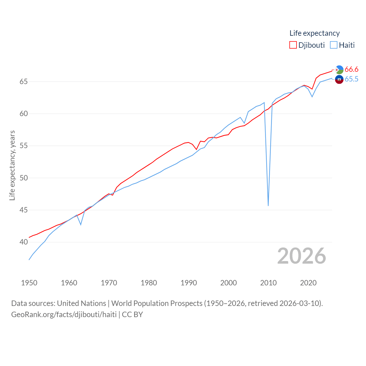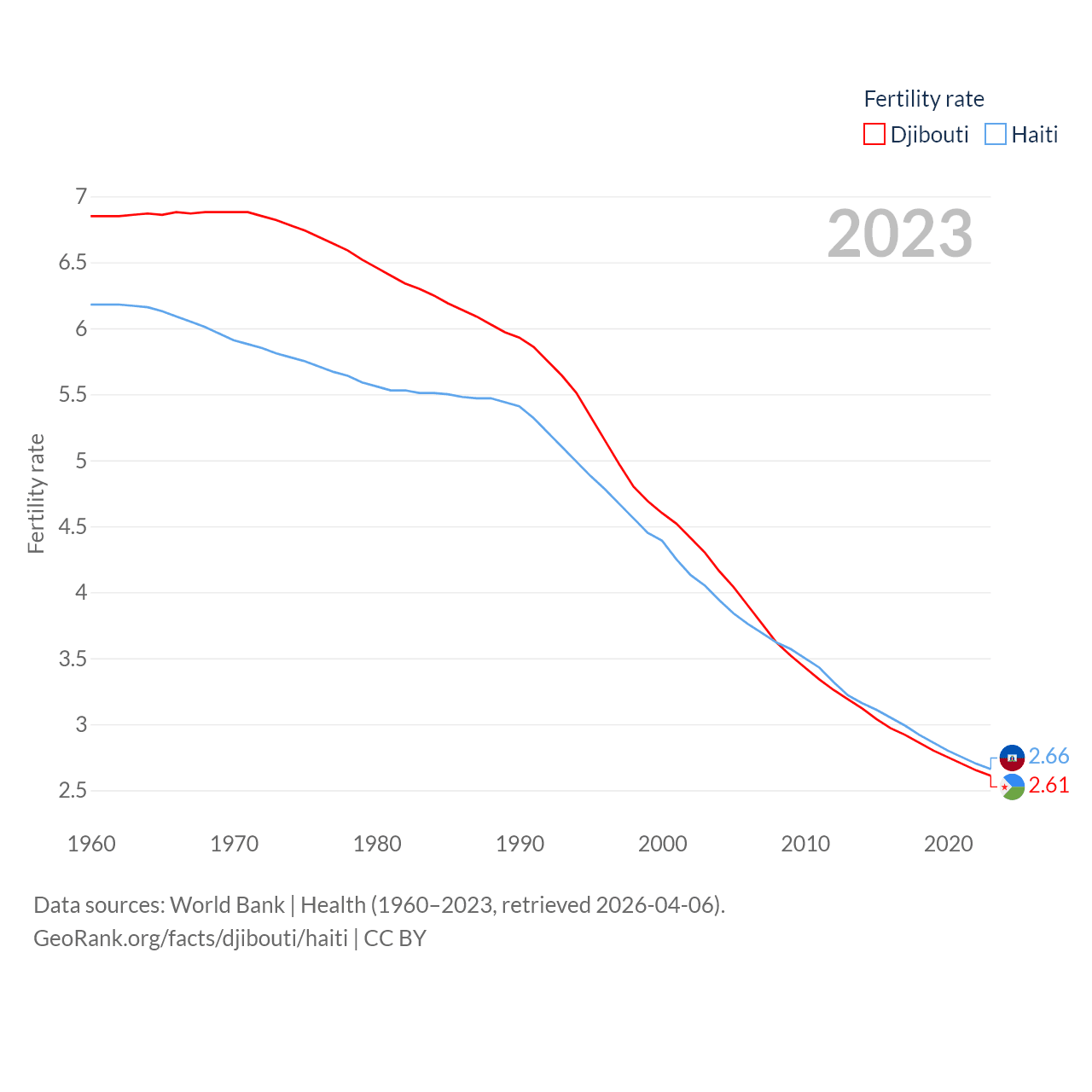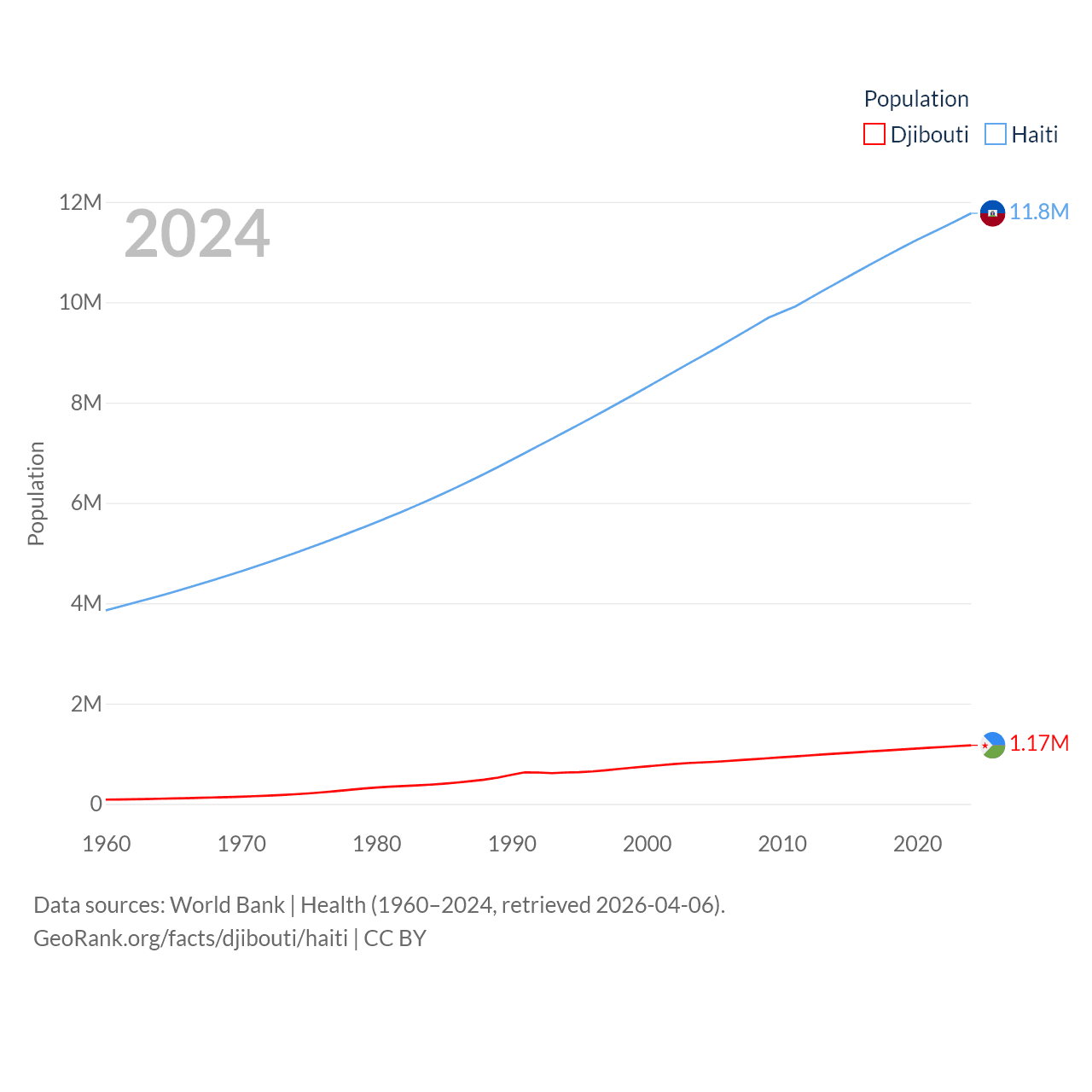 Djibouti has a population of 1.17M (ranked 158/197), compared with 11.8M in Haiti (ranked 83/197). Djibouti's land area is 8,950 sq mi versus 10,641 sq mi for Haiti (ranked 147th vs. 142nd).