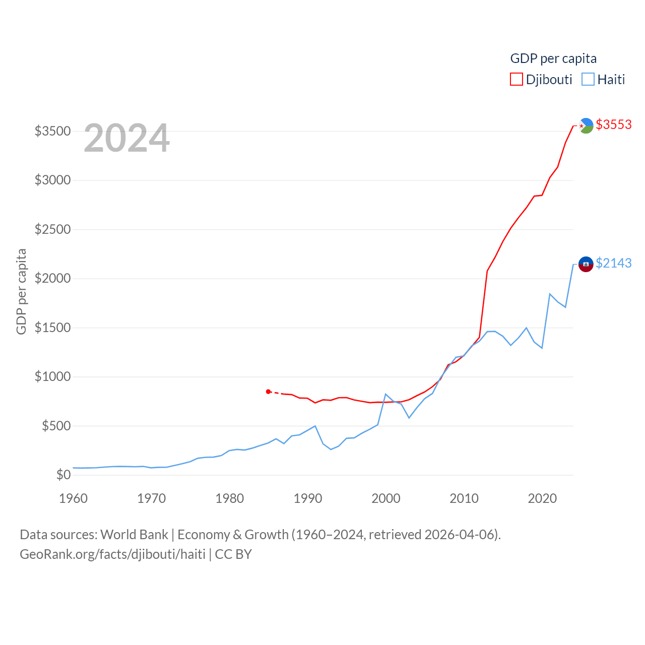By GDP, Djibouti ranks 165/197 ($4.15B) and Haiti ranks 117/197 ($25.2B). By GDP per capita, Djibouti ranks 133/197 ($3,553), while Haiti ranks 153/197 ($2,143).