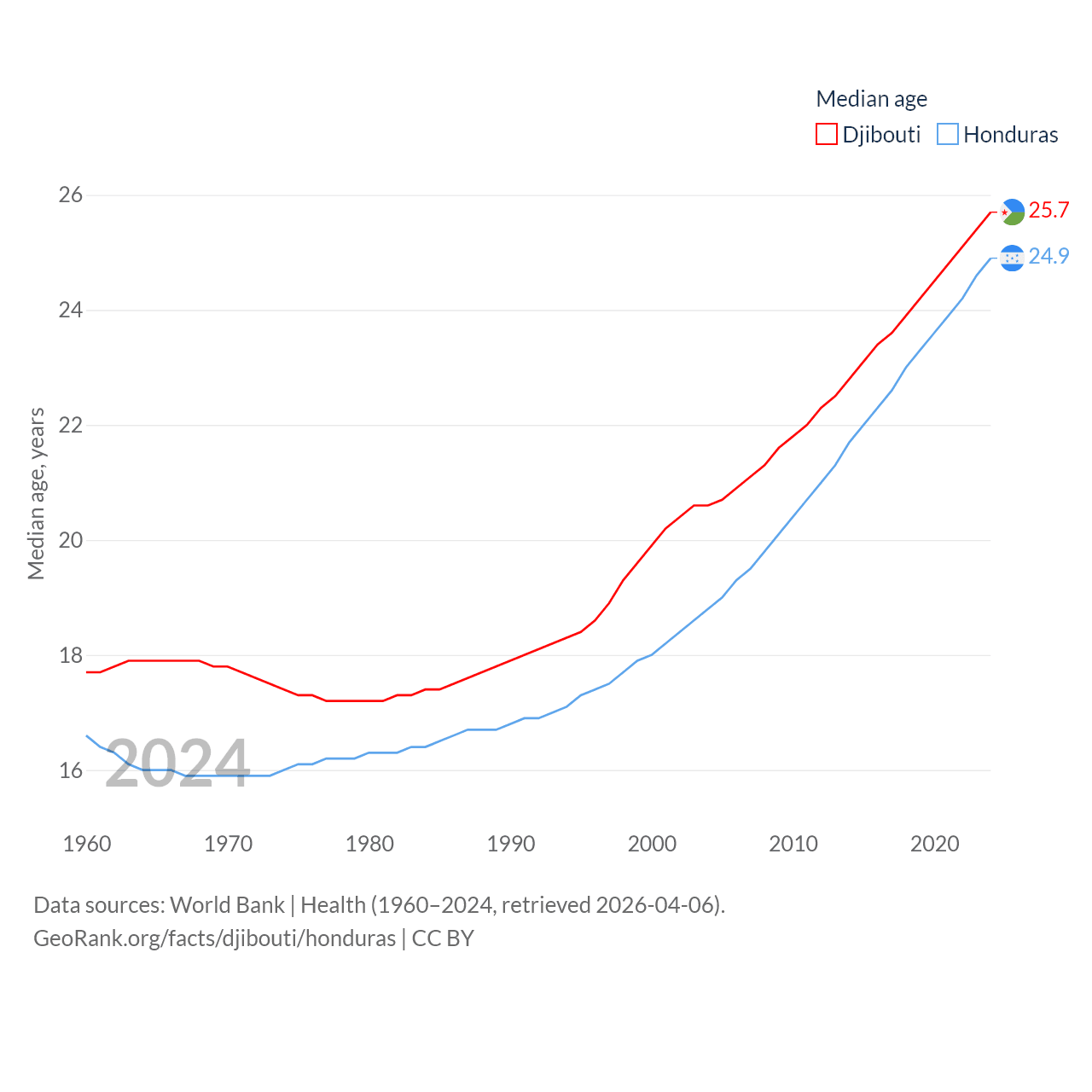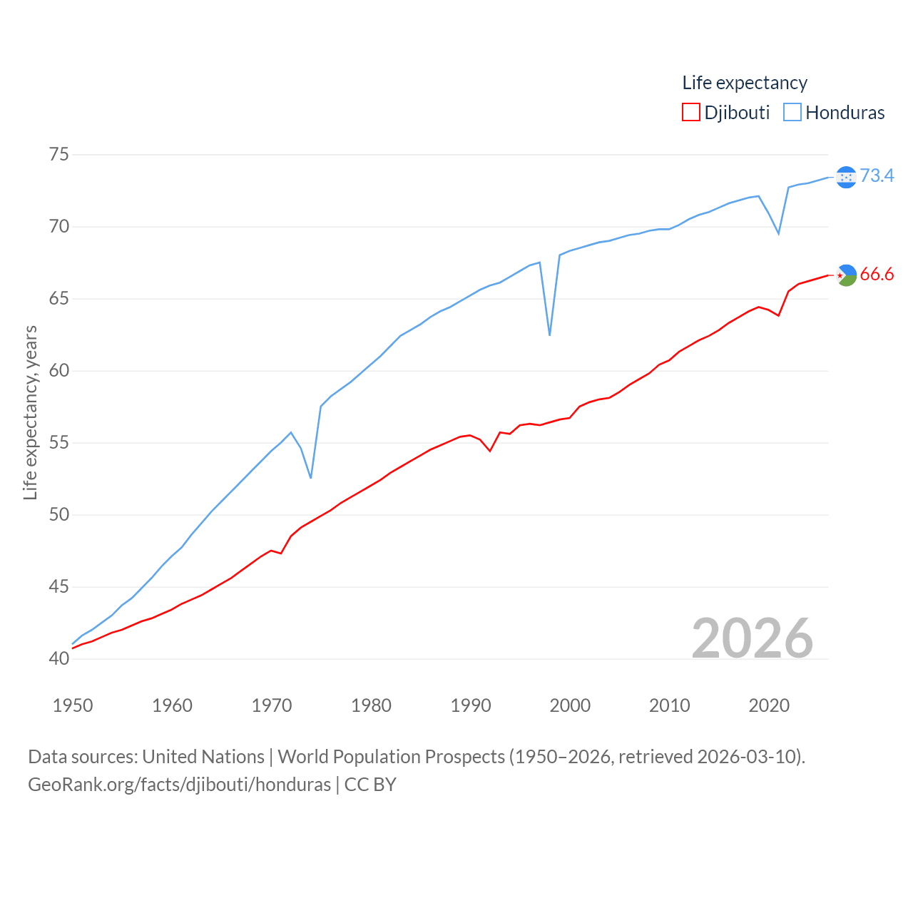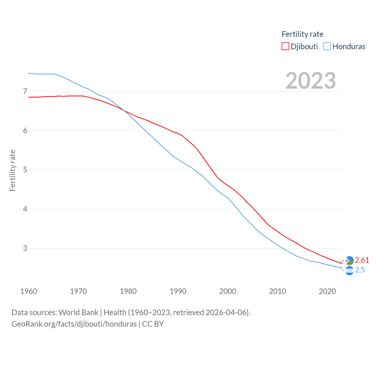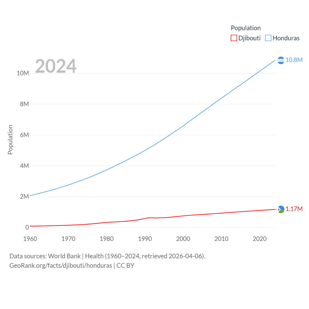 Djibouti has a population of 1.17M (ranked 158/197), compared with 10.8M in Honduras (ranked 89/197). Djibouti's land area is 8,950 sq mi versus 43,201 sq mi for Honduras (ranked 147th vs. 100th).