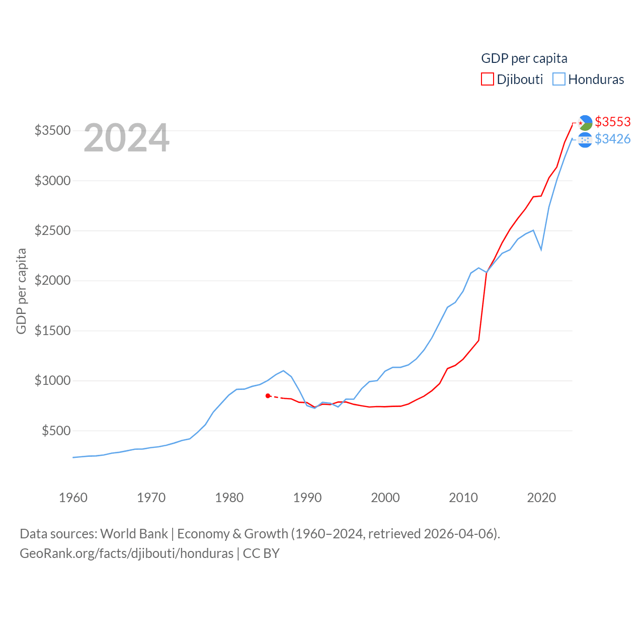 By GDP, Djibouti ranks 165/197 ($4.15B) and Honduras ranks 104/197 ($37.1B). By GDP per capita, Djibouti ranks 133/197 ($3,553), while Honduras ranks 136/197 ($3,426).