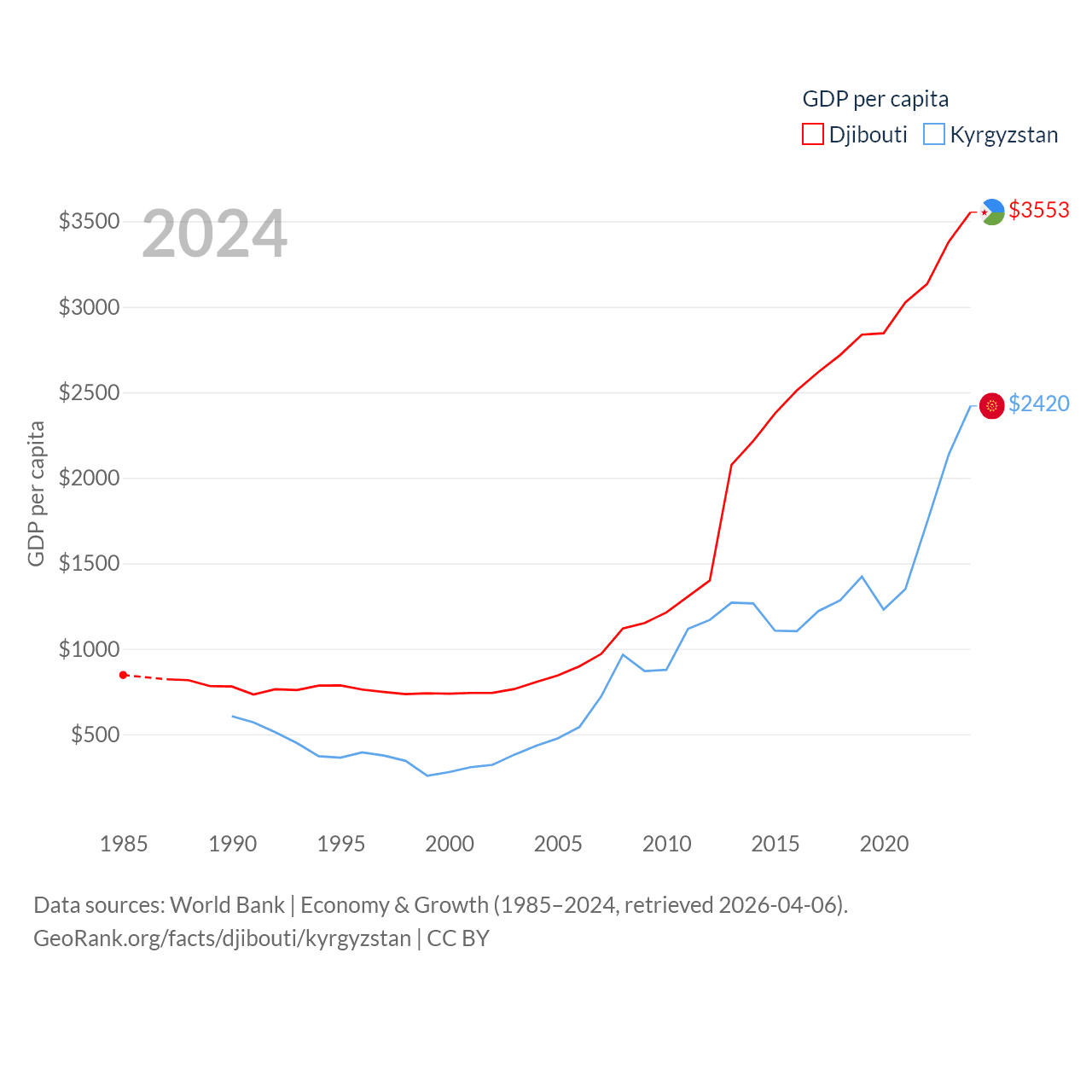 By GDP, Djibouti ranks 165/197 ($4.15B) and Kyrgyzstan ranks 135/197 ($17.5B). By GDP per capita, Djibouti ranks 133/197 ($3,553), while Kyrgyzstan ranks 150/197 ($2,420).