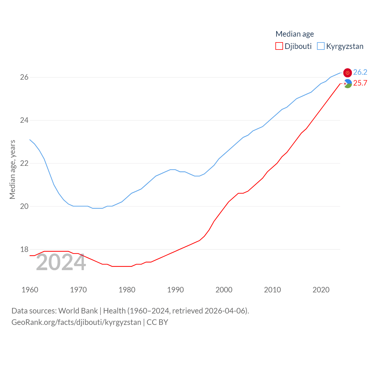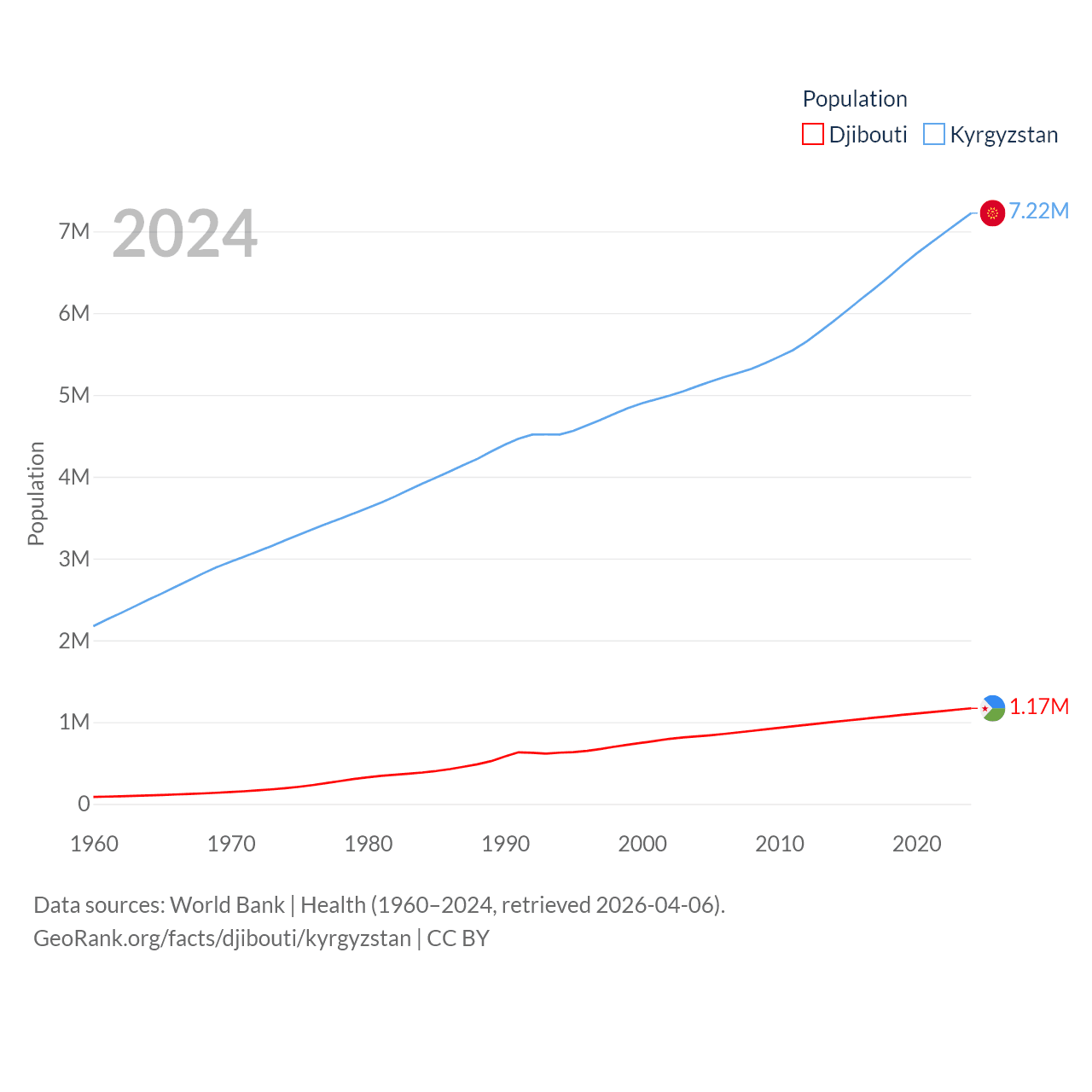 Djibouti has a population of 1.17M (ranked 158/197), compared with 7.22M in Kyrgyzstan (ranked 106/197). Djibouti's land area is 8,950 sq mi versus 74,054 sq mi for Kyrgyzstan (ranked 147th vs. 86th).