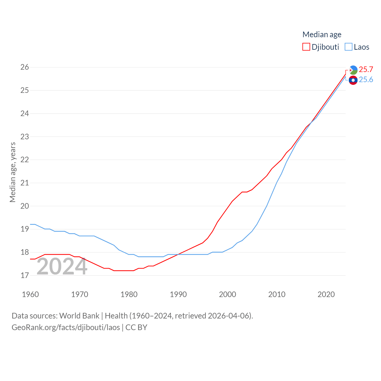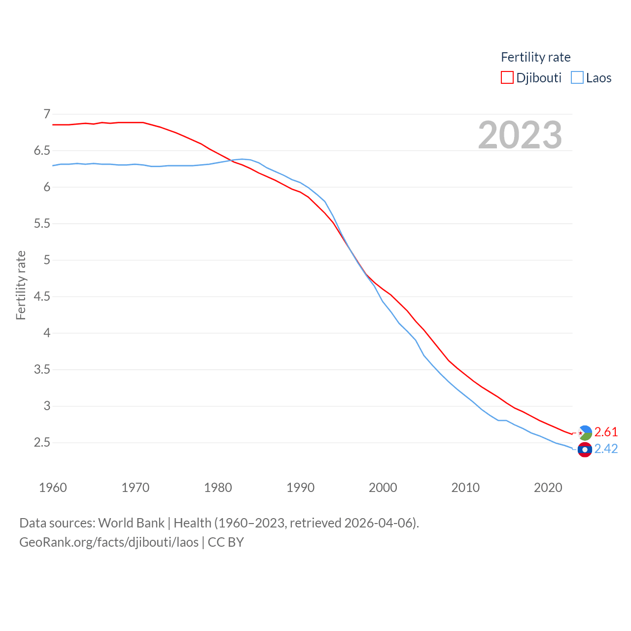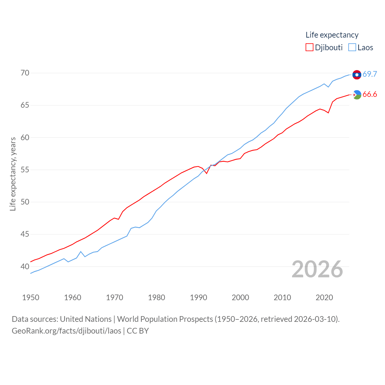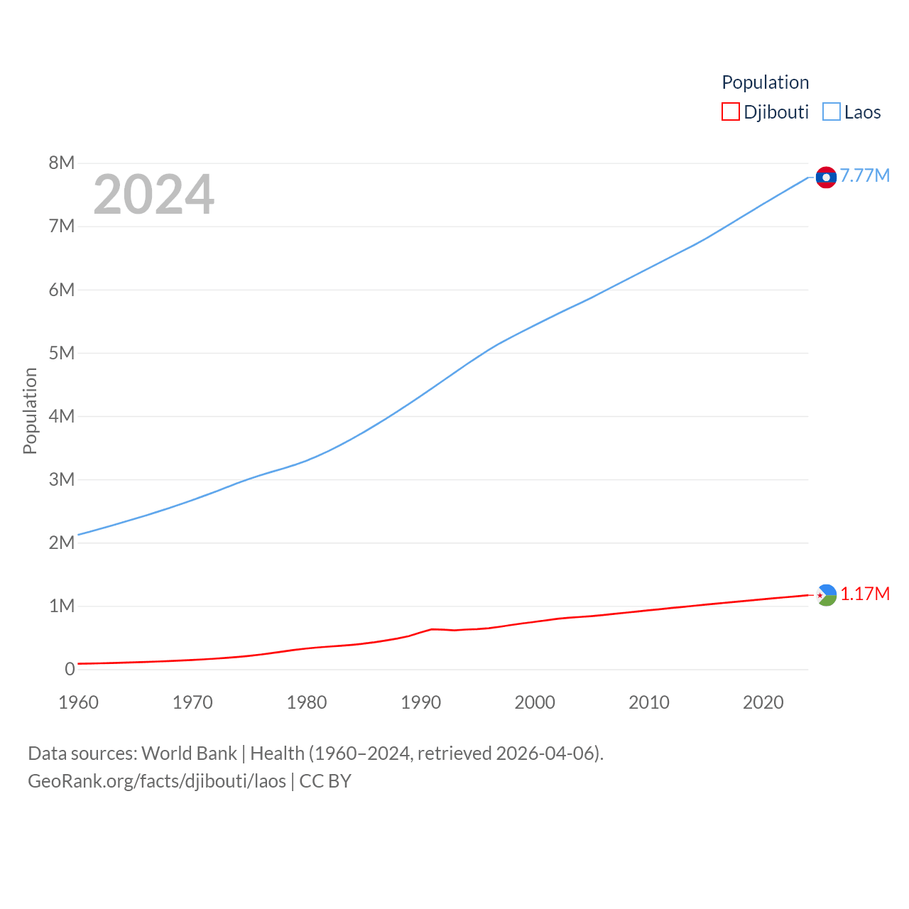 Djibouti has a population of 1.17M (ranked 158/197), compared with 7.77M in Laos (ranked 103/197). Djibouti's land area is 8,950 sq mi versus 89,112 sq mi for Laos (ranked 147th vs. 79th).