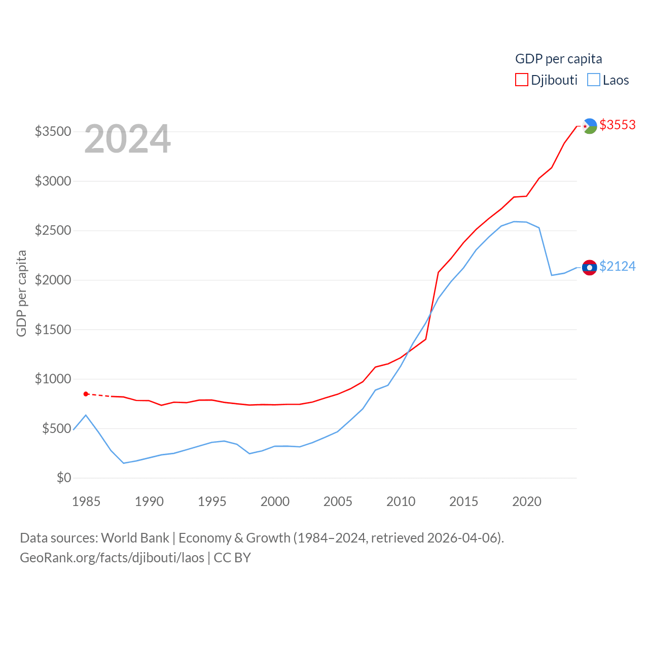 By GDP, Djibouti ranks 165/197 ($4.15B) and Laos ranks 139/197 ($16.5B). By GDP per capita, Djibouti ranks 133/197 ($3,553), while Laos ranks 155/197 ($2,124).