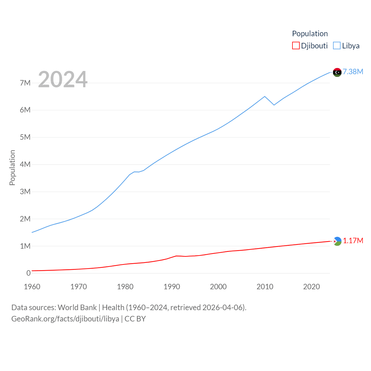 Djibouti has a population of 1.17M (ranked 158/197), compared with 7.38M in Libya (ranked 105/197). Djibouti's land area is 8,950 sq mi versus 679,362 sq mi for Libya (ranked 147th vs. 16th).