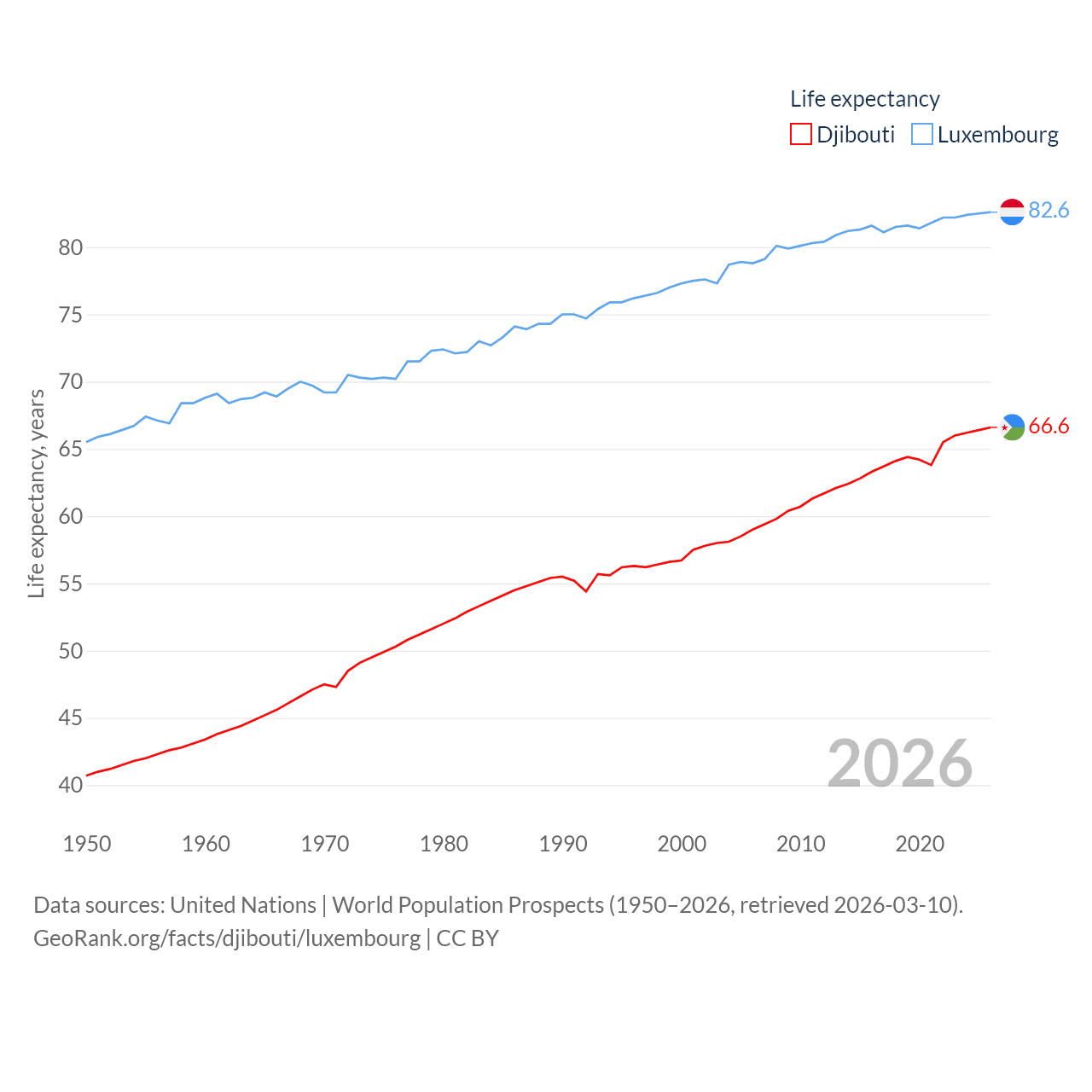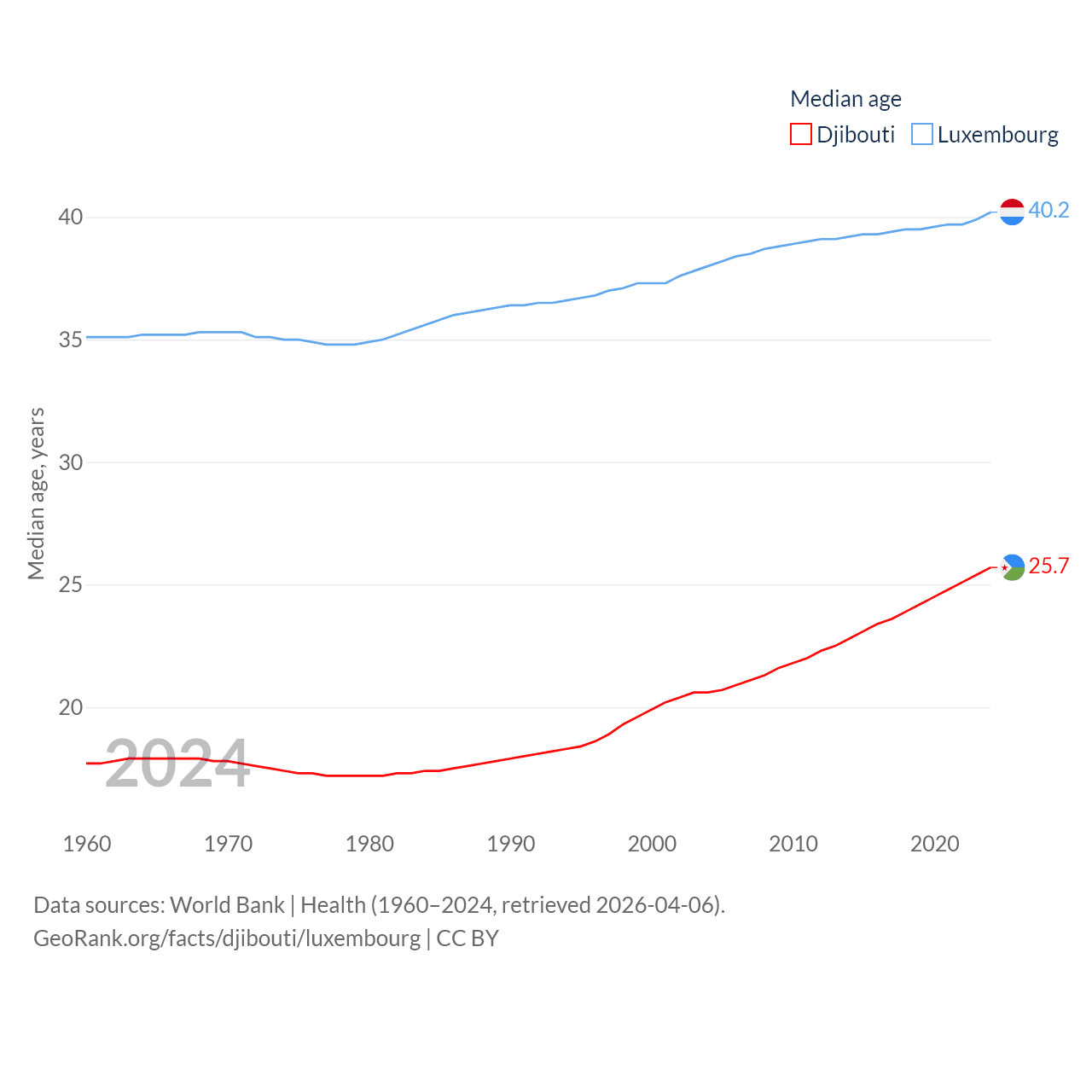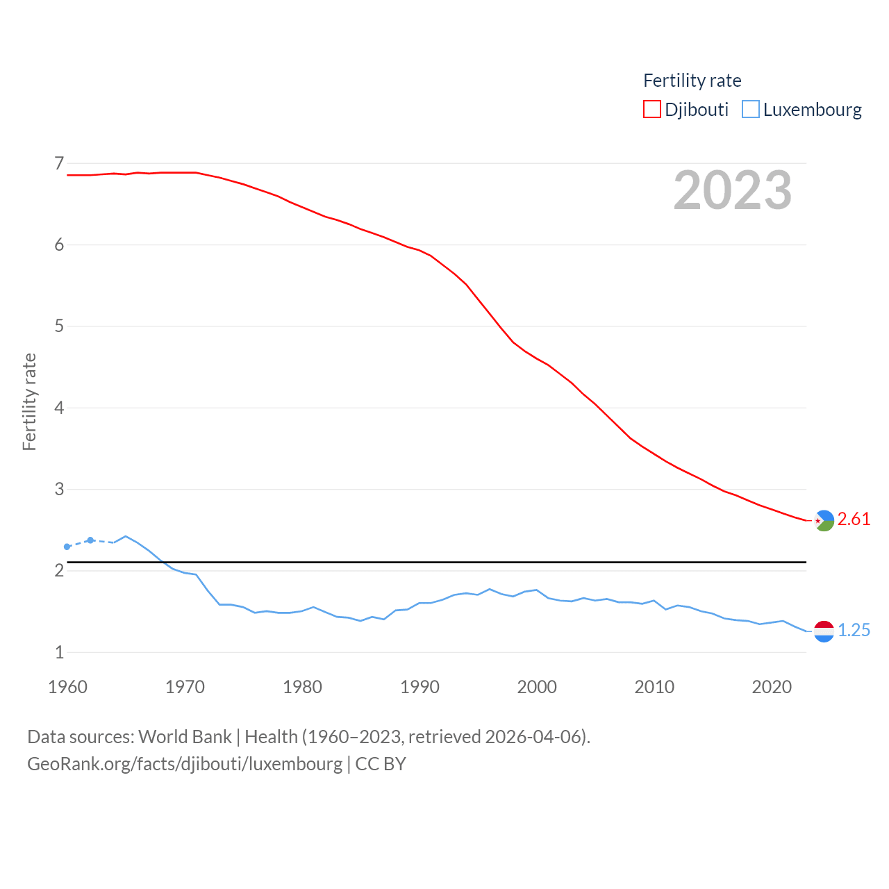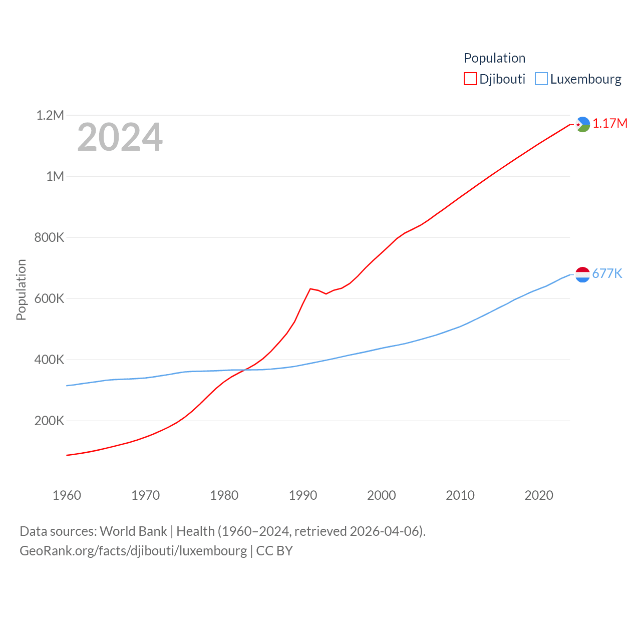Djibouti has a population of 1.17M (ranked 158/197), compared with 677K in Luxembourg (ranked 164/197). Djibouti's land area is 8,950 sq mi versus 994 sq mi for Luxembourg (ranked 147th vs. 169th).