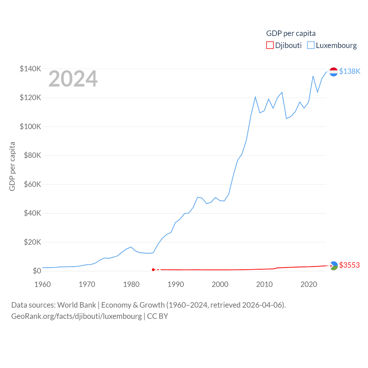 By GDP, Djibouti ranks 165/197 ($4.15B) and Luxembourg ranks 74/197 ($93.3B). By GDP per capita, Djibouti ranks 133/197 ($3,553), while Luxembourg ranks 3/197 ($137,782).