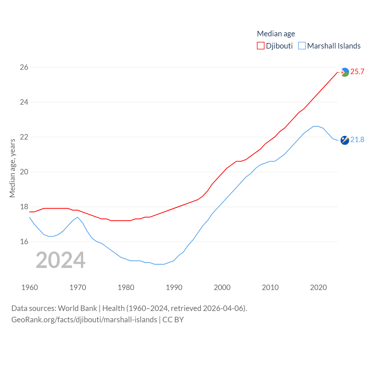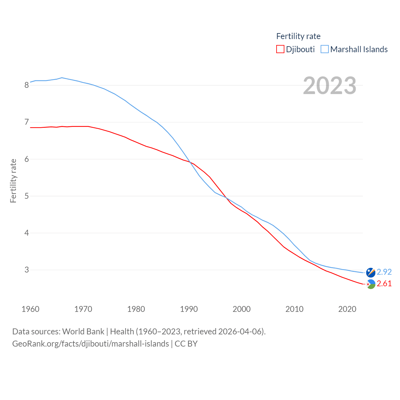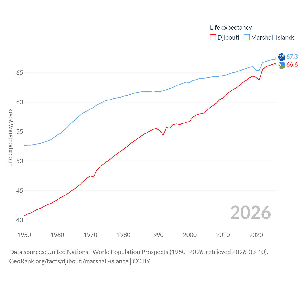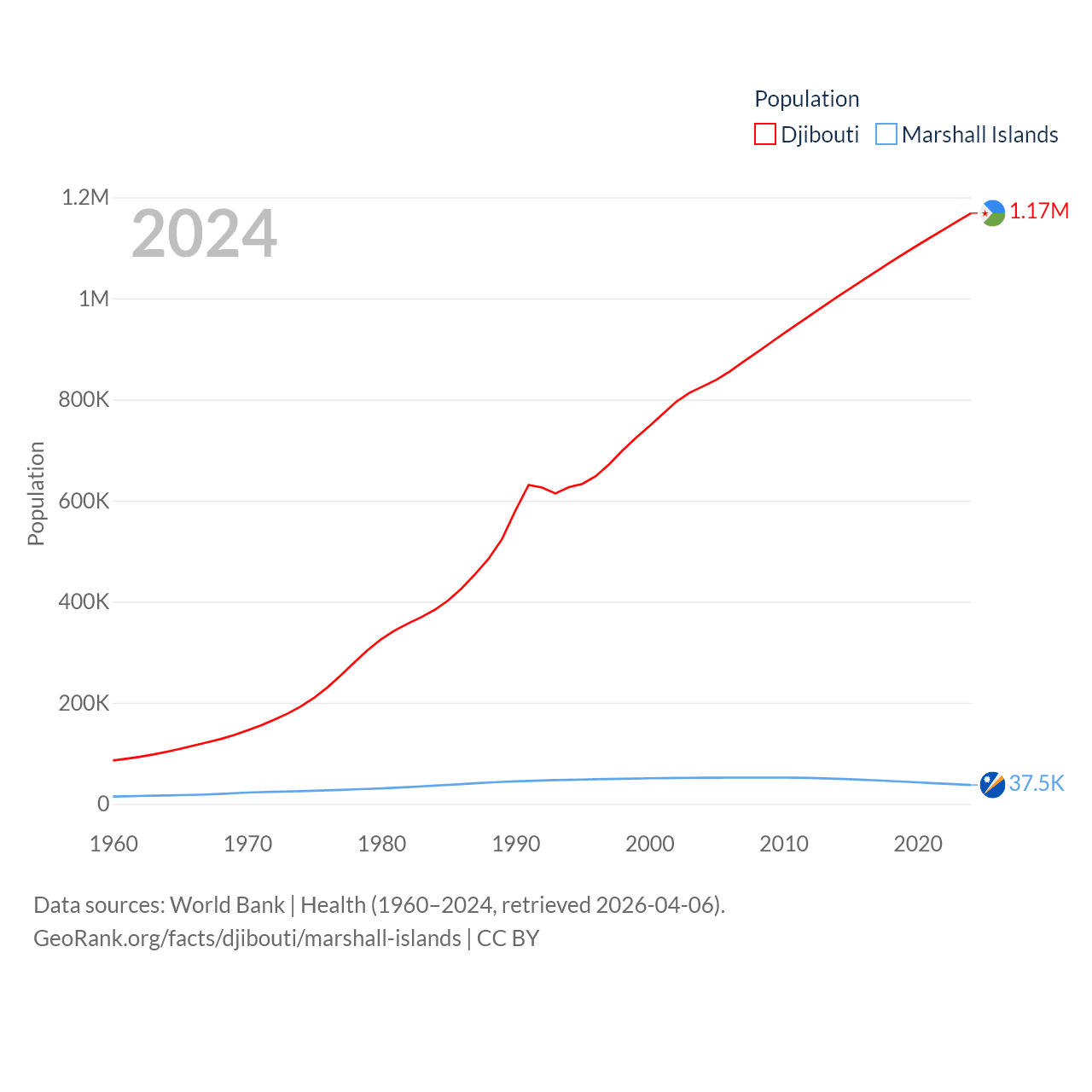 Djibouti has a population of 1.17M (ranked 158/197), compared with 37.5K in The Marshall Islands (ranked 192/197). Djibouti's land area is 8,950 sq mi versus 69.5 sq mi for The Marshall Islands (ranked 147th vs. 191st).