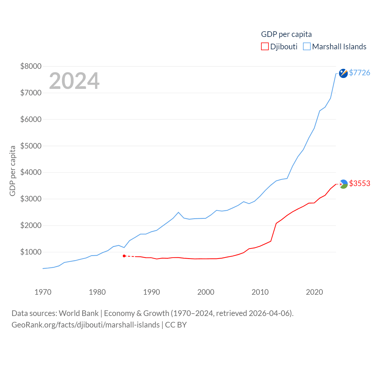 By GDP, Djibouti ranks 165/197 ($4.15B) and The Marshall Islands ranks 193/197 ($290M). By GDP per capita, Djibouti ranks 133/197 ($3,553), while The Marshall Islands ranks 96/197 ($7,726).