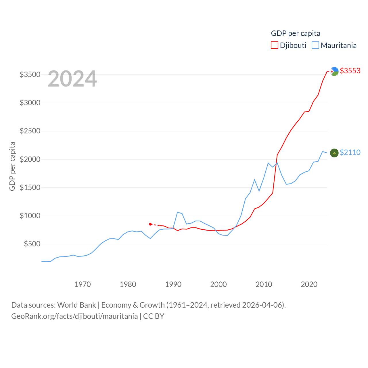By GDP, Djibouti ranks 165/197 ($4.15B) and Mauritania ranks 153/197 ($10.9B). By GDP per capita, Djibouti ranks 133/197 ($3,553), while Mauritania ranks 156/197 ($2,110).
