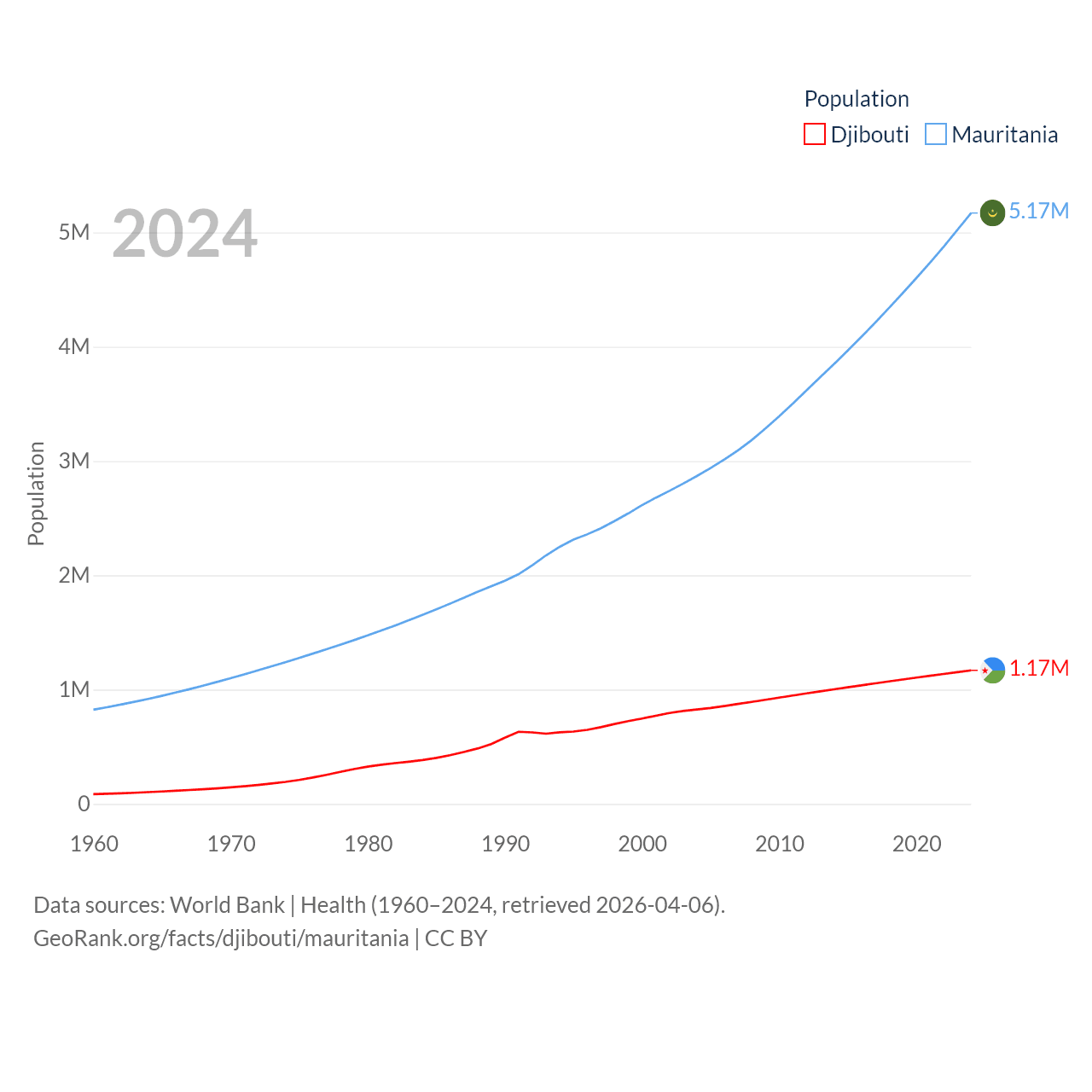 Djibouti has a population of 1.17M (ranked 158/197), compared with 5.17M in Mauritania (ranked 125/197). Djibouti's land area is 8,950 sq mi versus 397,955 sq mi for Mauritania (ranked 147th vs. 28th).