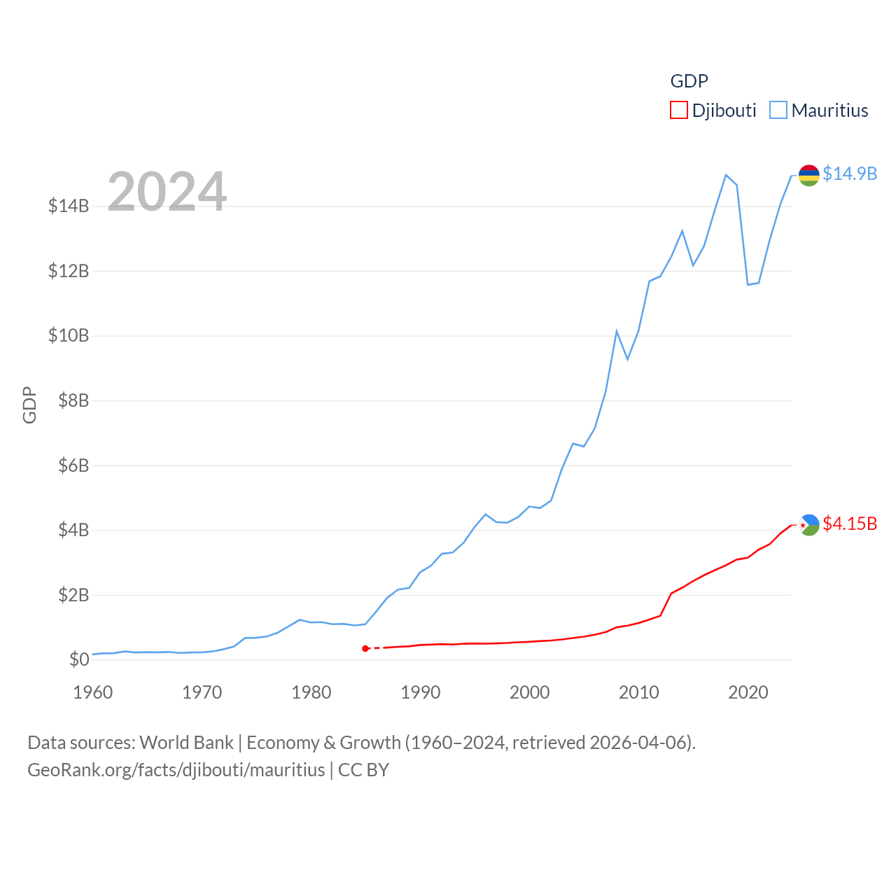 By GDP, Djibouti ranks 165/197 ($4.15B) and Mauritius ranks 143/197 ($14.9B). By GDP per capita, Djibouti ranks 133/197 ($3,553), while Mauritius ranks 78/197 ($11,991).