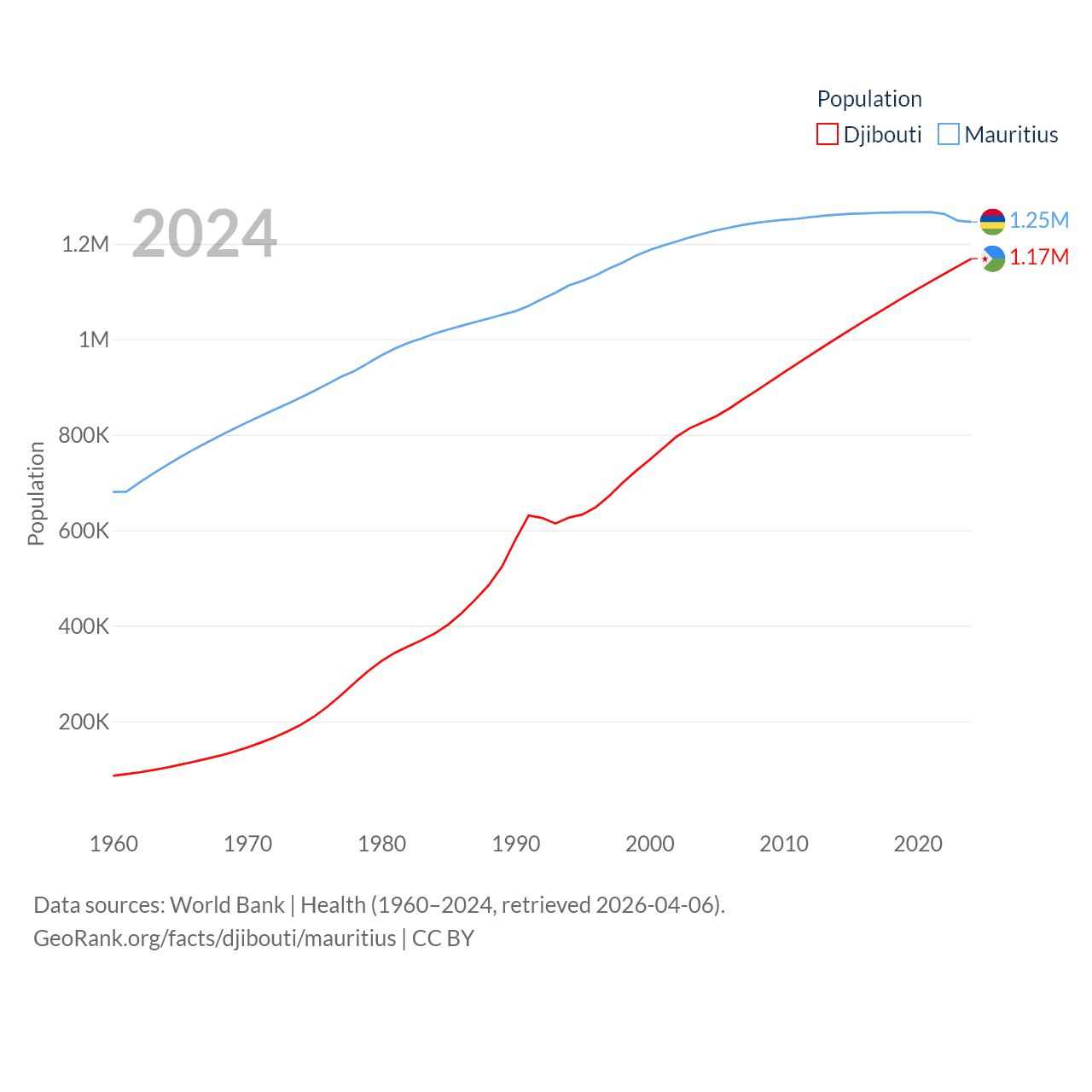 Djibouti has a population of 1.17M (ranked 158/197), compared with 1.25M in Mauritius (ranked 156/197). Djibouti's land area is 8,950 sq mi versus 771 sq mi for Mauritius (ranked 147th vs. 170th).