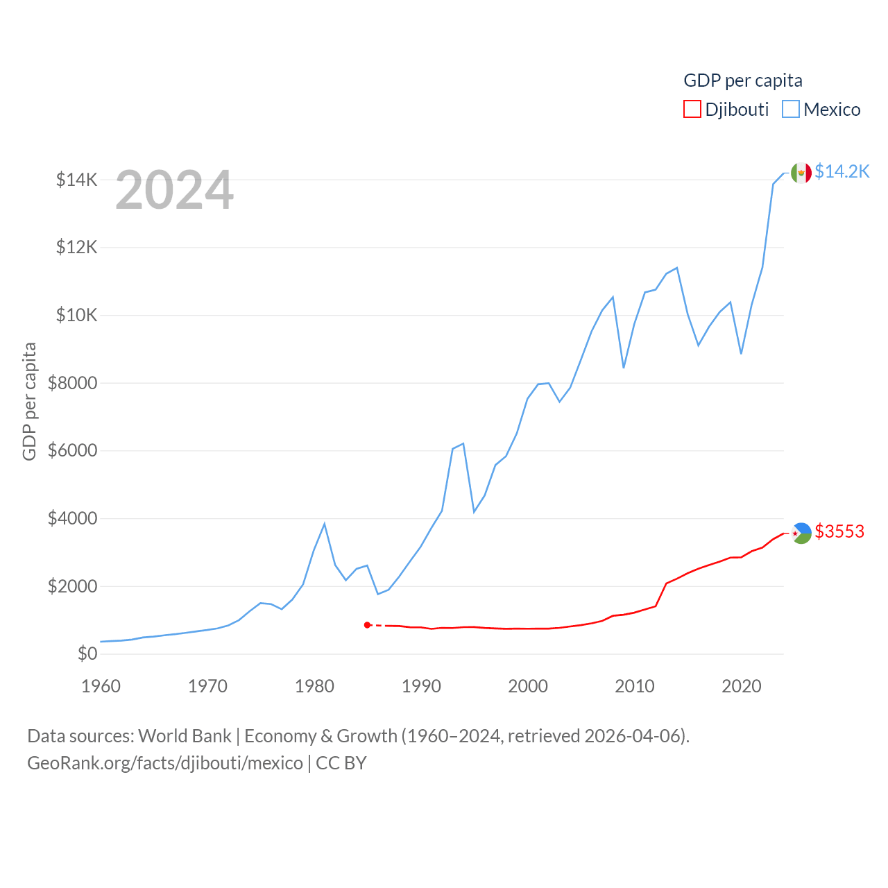 By GDP, Djibouti ranks 165/197 ($4.15B) and Mexico ranks 13/197 ($1.86T). By GDP per capita, Djibouti ranks 133/197 ($3,553), while Mexico ranks 69/197 ($14,186).