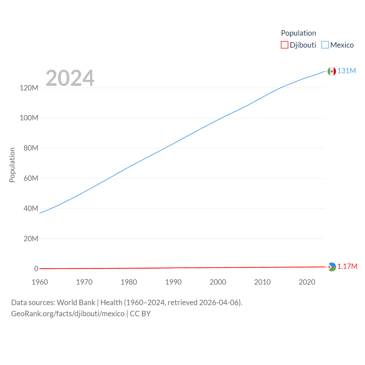 Djibouti has a population of 1.17M (ranked 158/197), compared with 131M in Mexico (ranked 11/197). Djibouti's land area is 8,950 sq mi versus 750,563 sq mi for Mexico (ranked 147th vs. 13th).