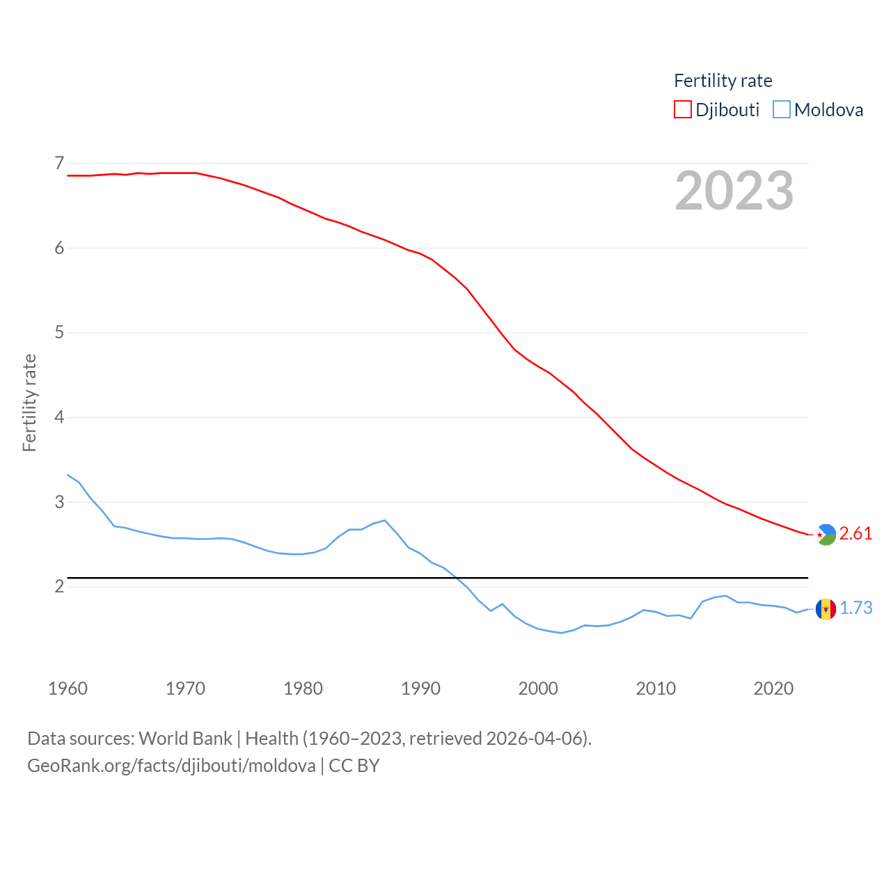 Djibouti has a population of 1.17M (ranked 158/197), compared with 2.4M in Moldova (ranked 143/197). Djibouti's land area is 8,950 sq mi versus 12,714 sq mi for Moldova (ranked 147th vs. 135th).