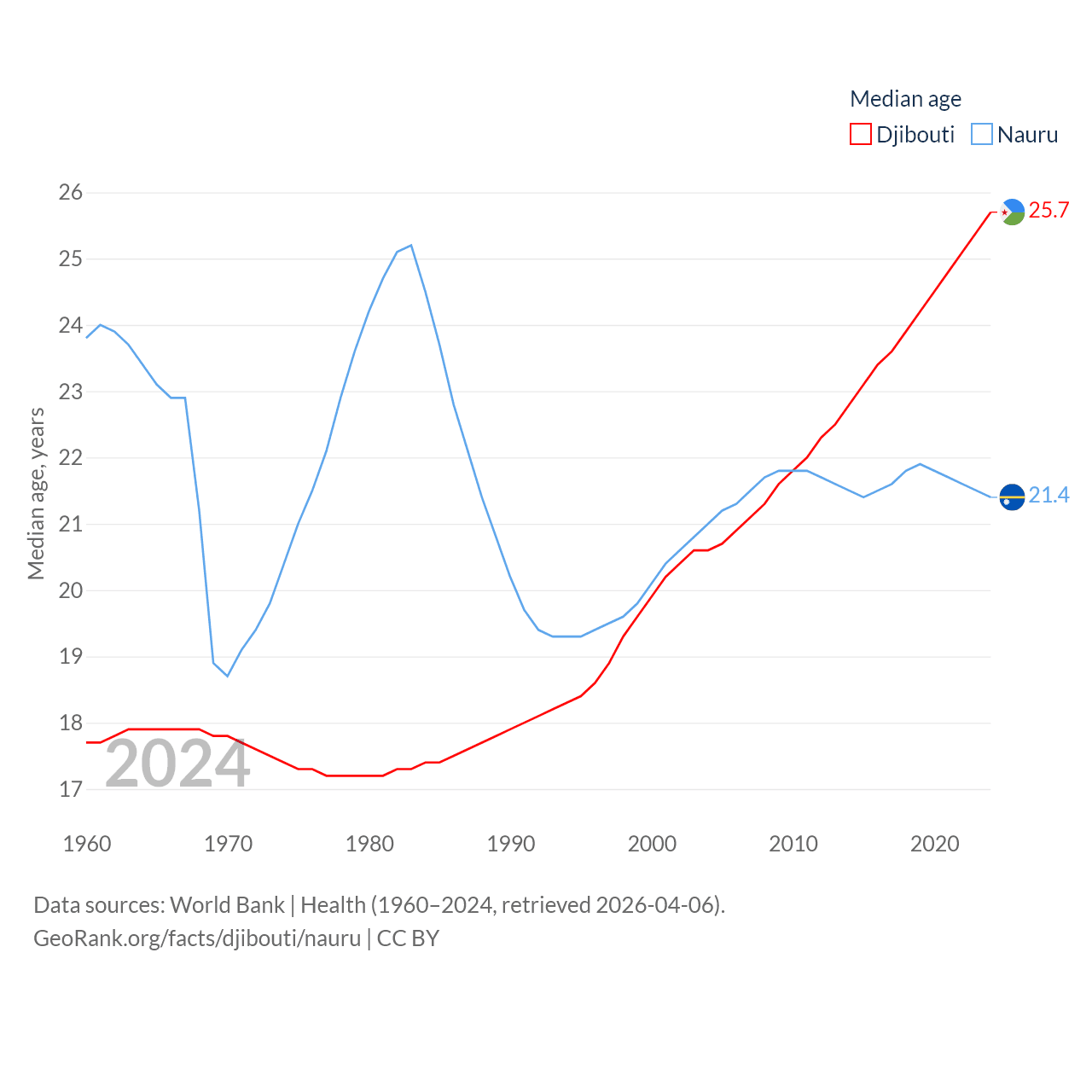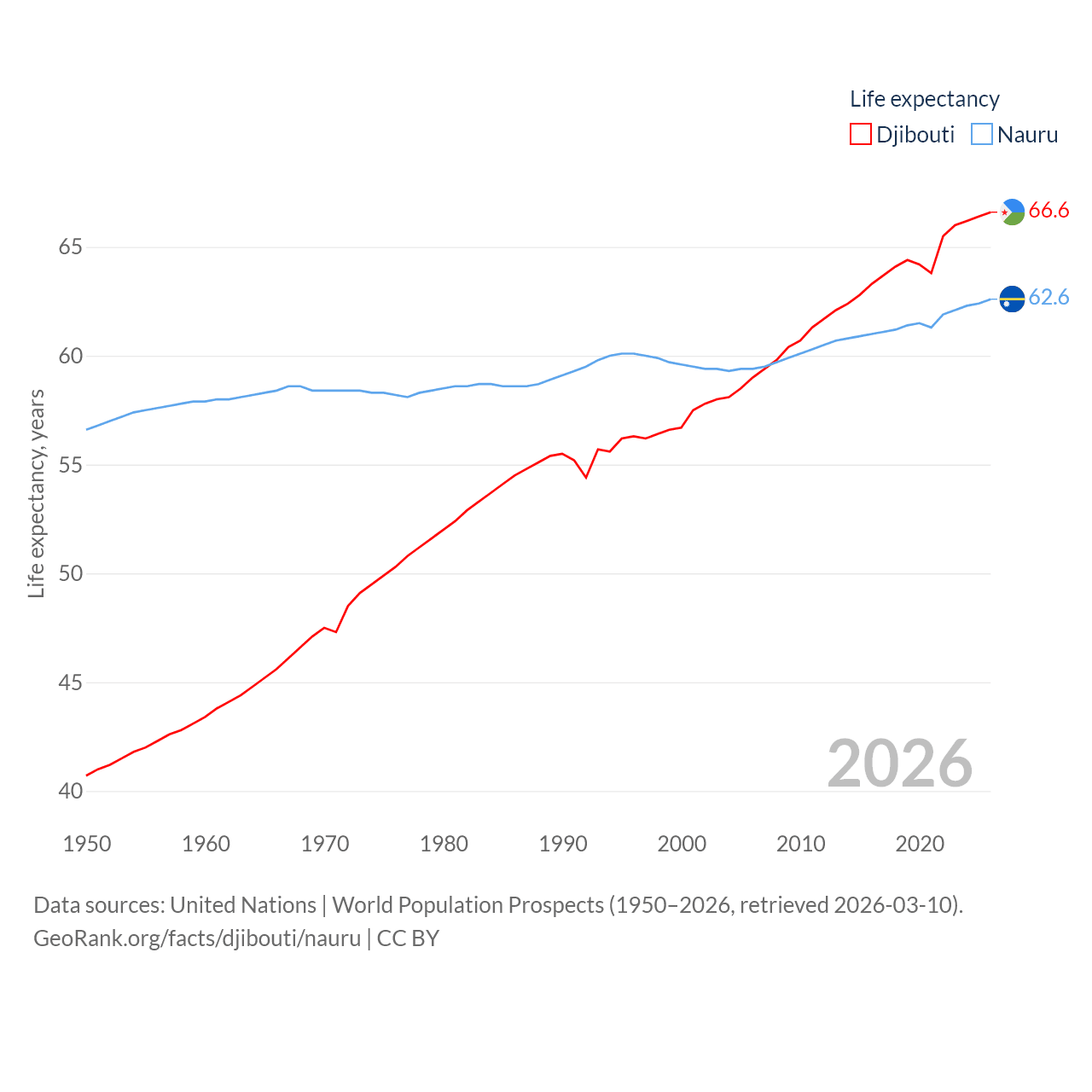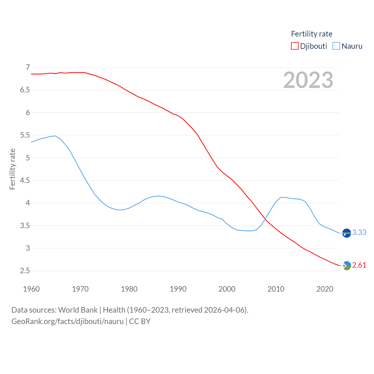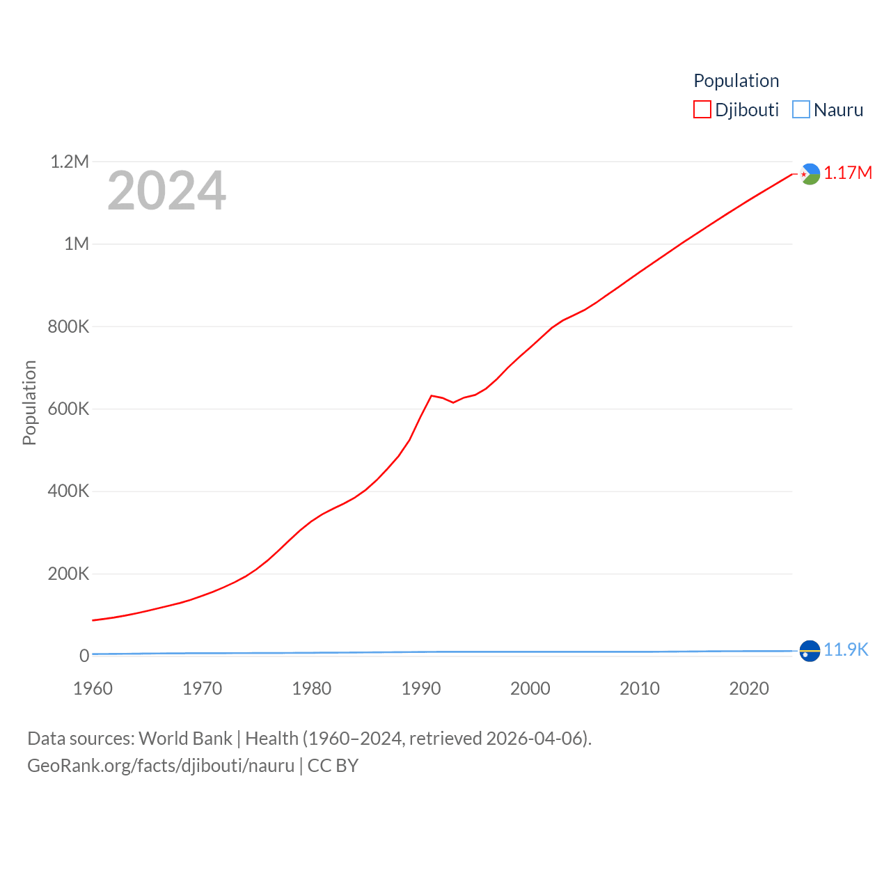 Djibouti has a population of 1.17M (ranked 158/197), compared with 11.9K in Nauru (ranked 195/197). Djibouti's land area is 8,950 sq mi versus 7.72 sq mi for Nauru (ranked 147th vs. 195th).