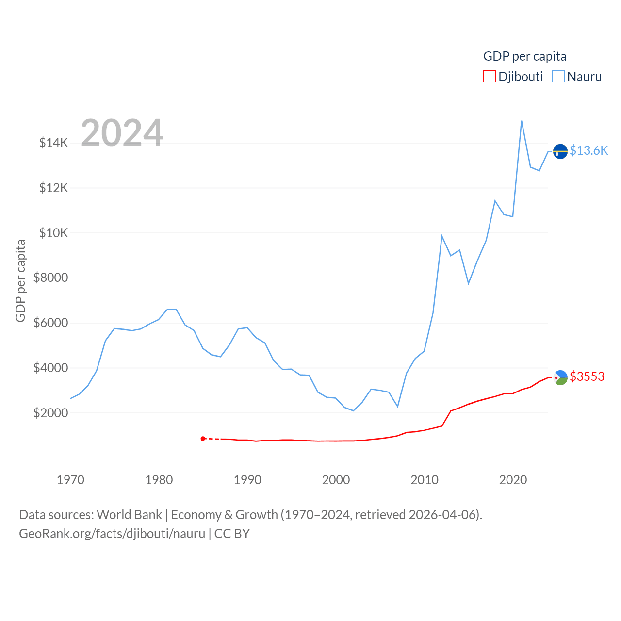 By GDP, Djibouti ranks 165/197 ($4.15B) and Nauru ranks 195/197 ($163M). By GDP per capita, Djibouti ranks 133/197 ($3,553), while Nauru ranks 74/197 ($13,609).
