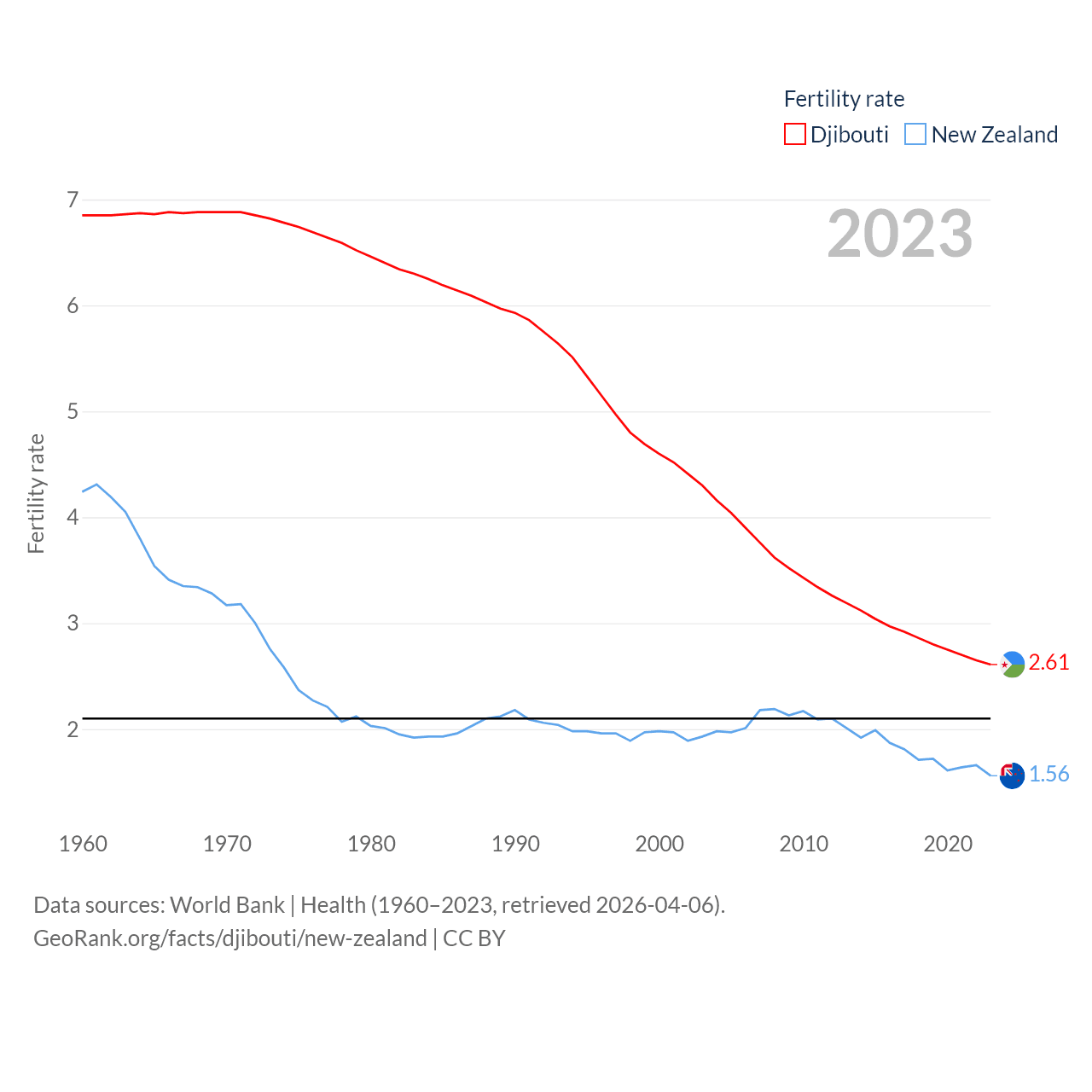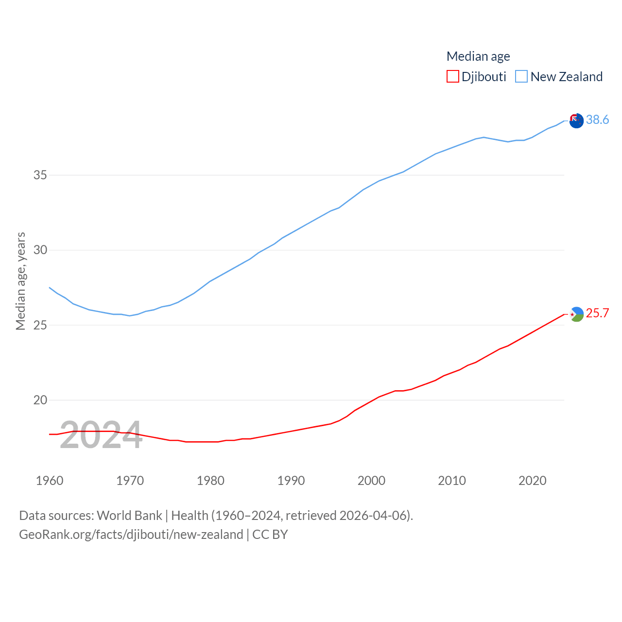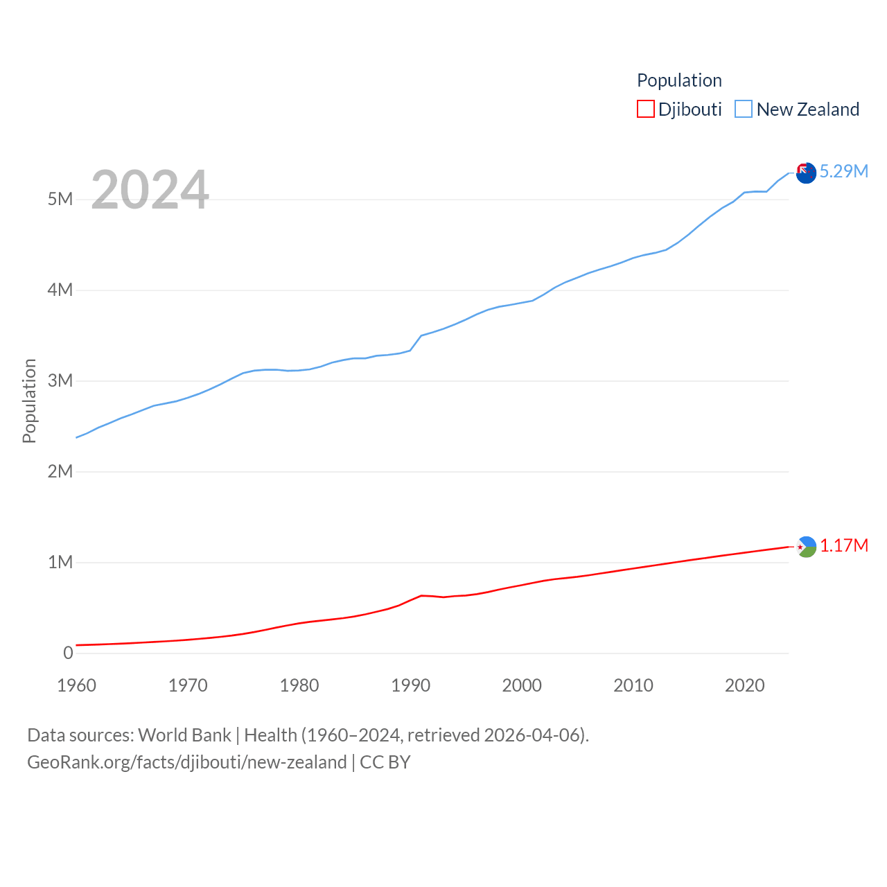 Djibouti has a population of 1.17M (ranked 158/197), compared with 5.29M in New Zealand (ranked 123/197). Djibouti's land area is 8,950 sq mi versus 101,665 sq mi for New Zealand (ranked 147th vs. 74th).