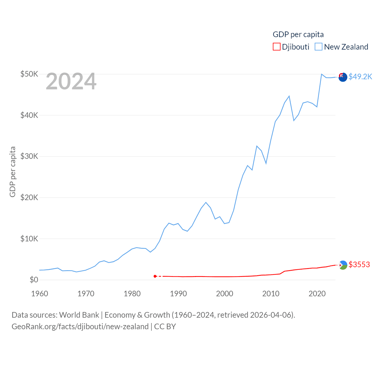 By GDP, Djibouti ranks 165/197 ($4.15B) and New Zealand ranks 52/197 ($260B). By GDP per capita, Djibouti ranks 133/197 ($3,553), while New Zealand ranks 26/197 ($49,205).