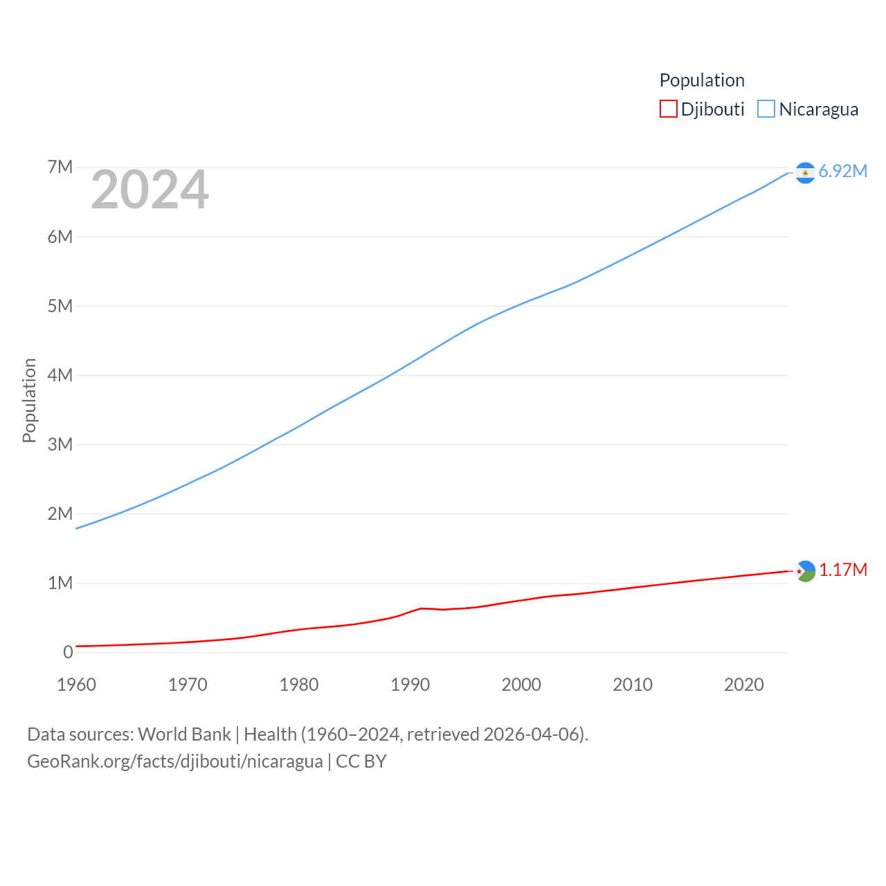 Djibouti has a population of 1.17M (ranked 158/197), compared with 6.92M in Nicaragua (ranked 108/197). Djibouti's land area is 8,950 sq mi versus 46,464 sq mi for Nicaragua (ranked 147th vs. 98th).