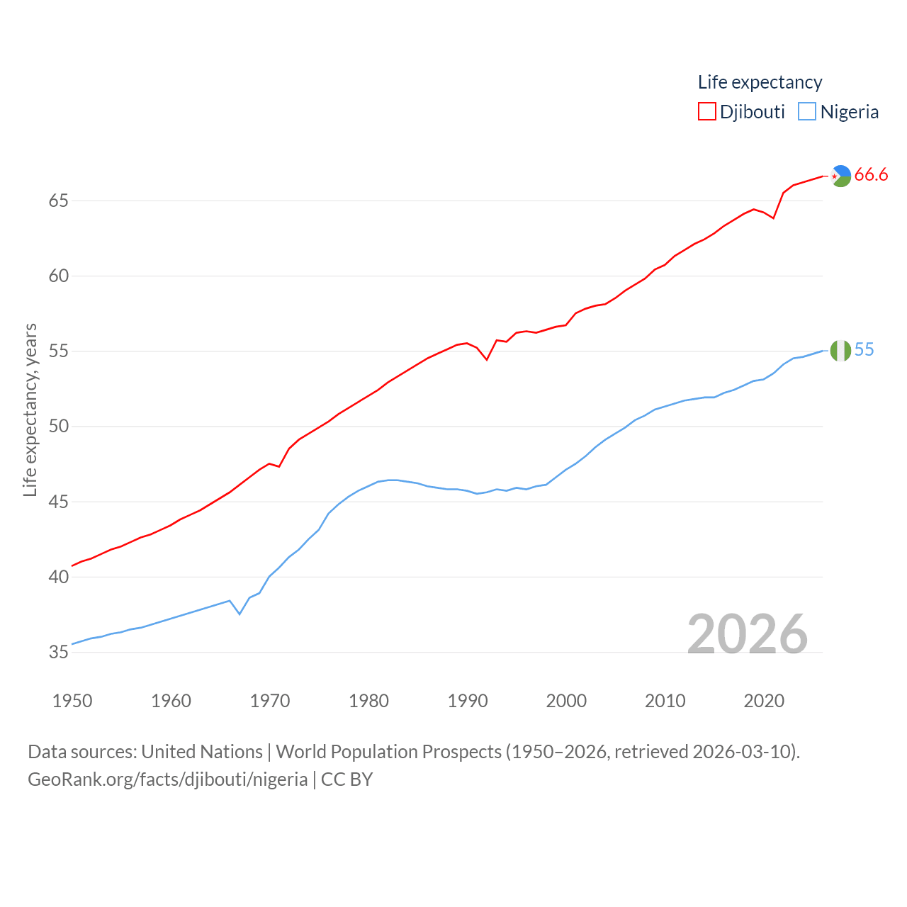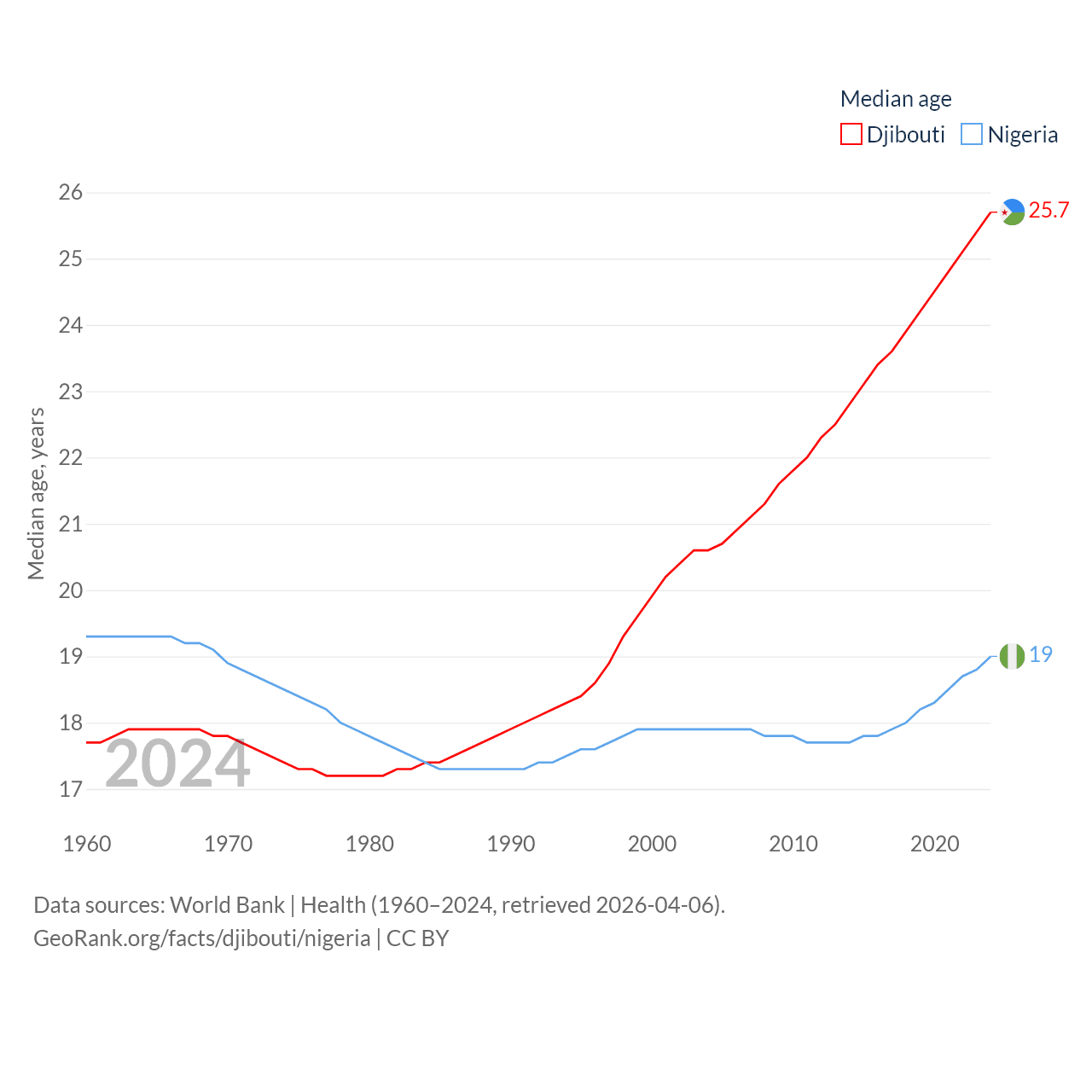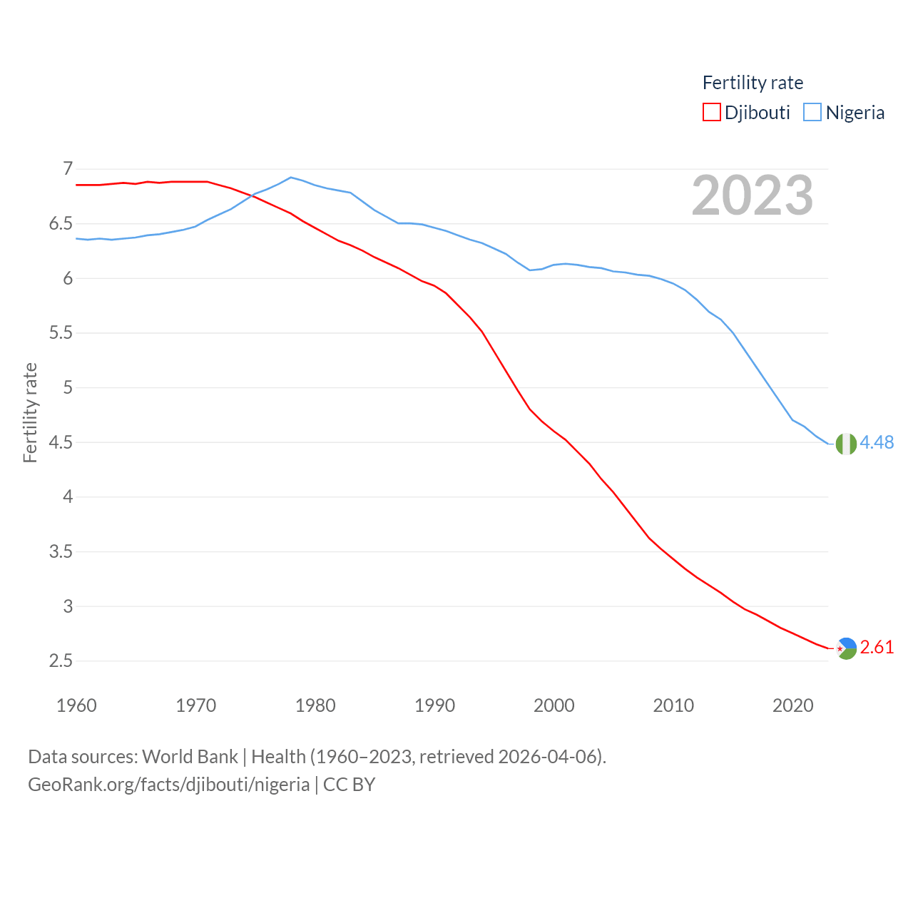 Djibouti has a population of 1.17M (ranked 158/197), compared with 233M in Nigeria (ranked 6/197). Djibouti's land area is 8,950 sq mi versus 351,650 sq mi for Nigeria (ranked 147th vs. 30th).
