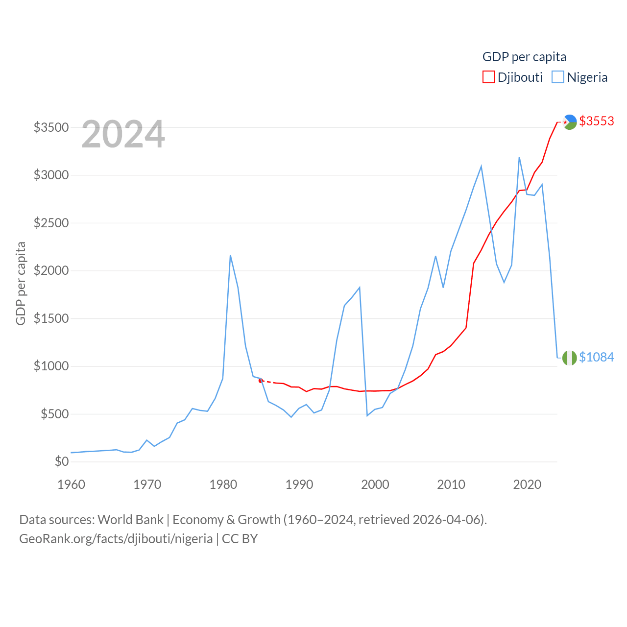 By GDP, Djibouti ranks 165/197 ($4.15B) and Nigeria ranks 54/197 ($252B). By GDP per capita, Djibouti ranks 133/197 ($3,553), while Nigeria ranks 174/197 ($1,084).